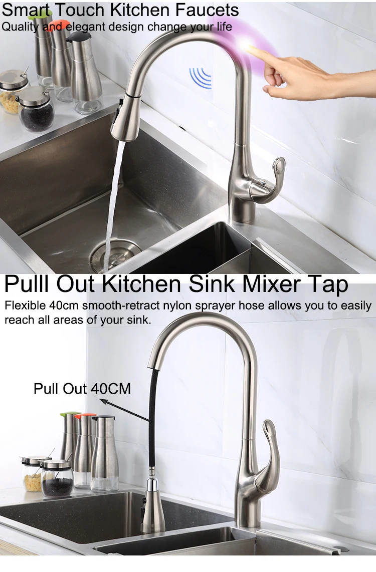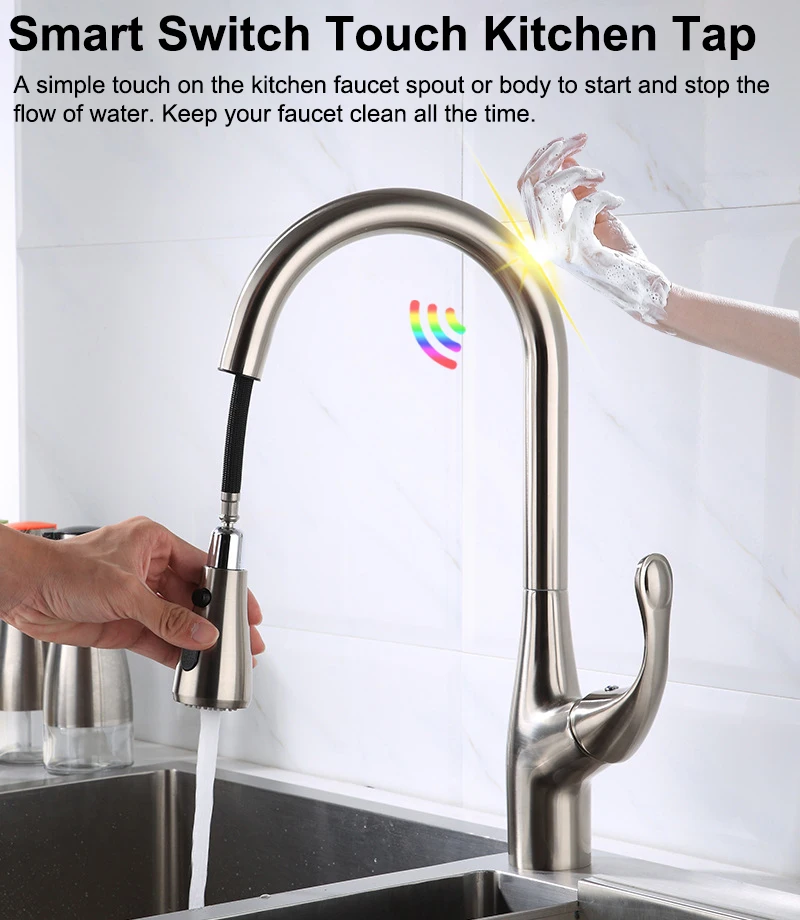 Robinet de cuisine tactile en Nickel brossé, en laiton de qualité, mitigeur d’évier de cuisine extractible chaud et froid, robinets de cuisine tactiles à capteur intelligentRobinet de cuisine tactile en Nickel brossé, en laiton de qualité, mitigeur d’évier de cuisine extractible chaud et froid, robinets de cuisine tactiles à capteur intelligent