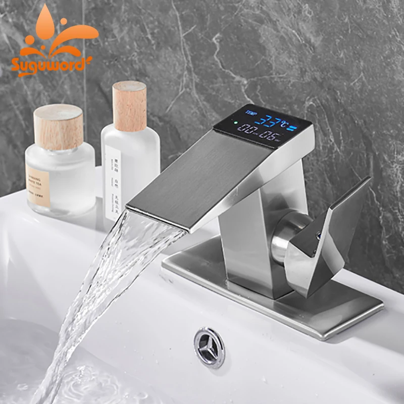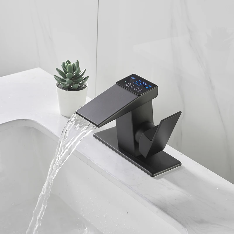 Robinet de lavabo à affichage numérique intelligent Robinets cascade monotrou Mélangeur d’eau chaude froide Salle de bain Grue de baignoire de lavage
