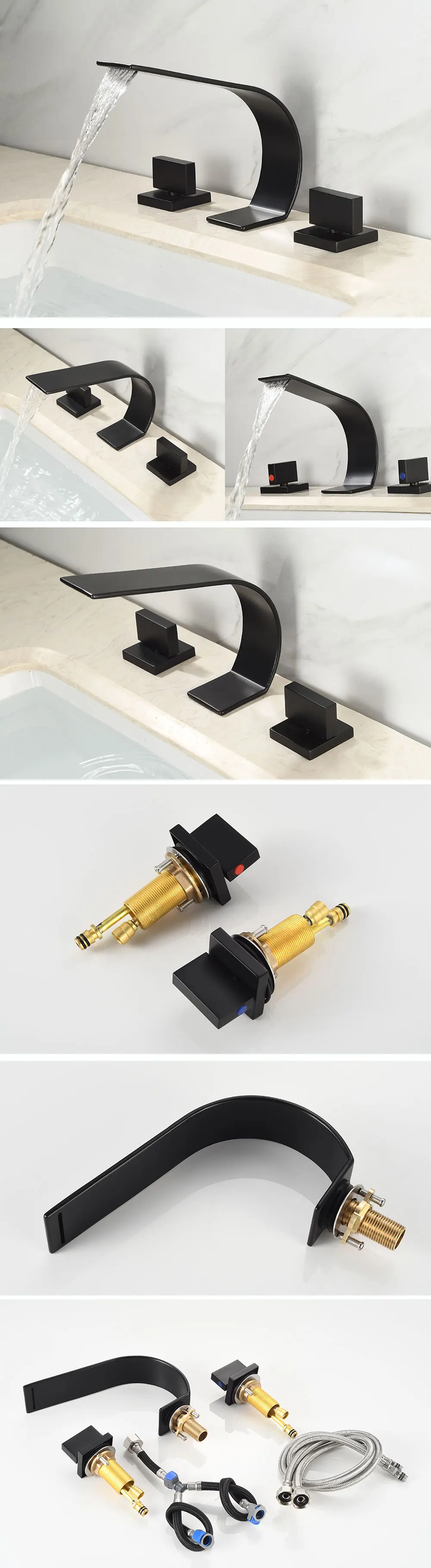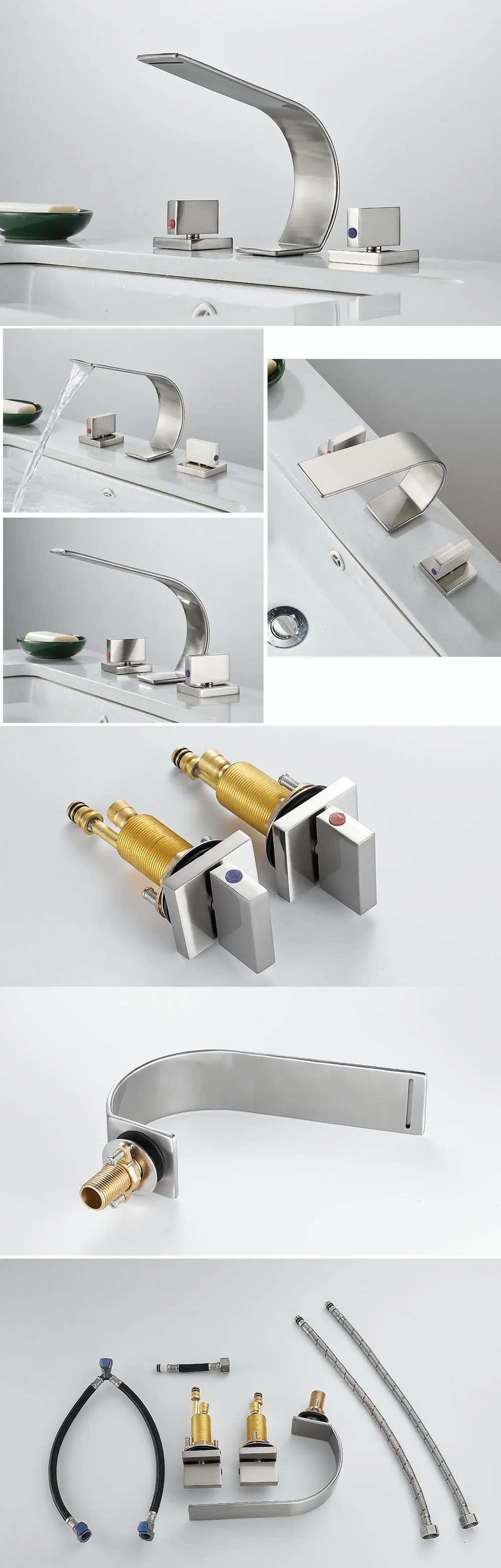 Robinet de lavabo de salle de bains, cascade incurvée, monté sur le pont, Double poignée, mélangeur d’eau chaude et froide monotrouRobinet de lavabo de salle de bains, cascade incurvée, monté sur le pont, Double poignée, mélangeur d’eau chaude et froide monotrou