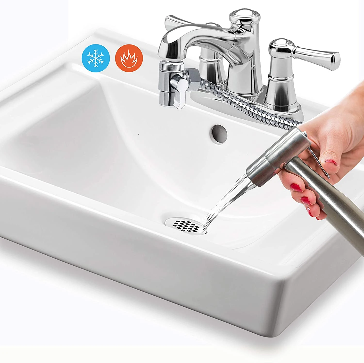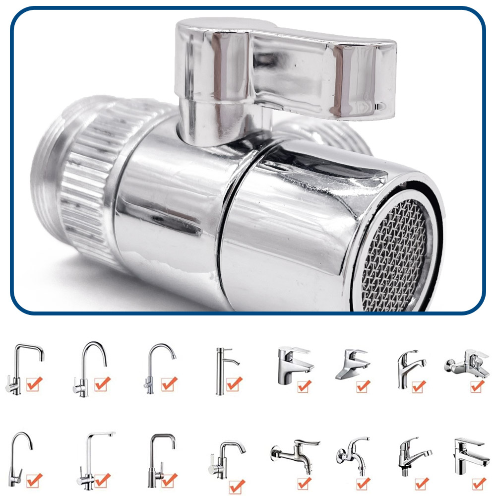 La vanne de dérivation est livrée avec le écrou du connecteur d’aérateur vous permettant de serrer au robinet mitigeur de lavabo qui fait un accessoire facile.Si vous devez l’utiliser au robinet de cuisine, retirer soigneusement le connecteur d’aérateur et logez la valve dans le bec de cuisine.