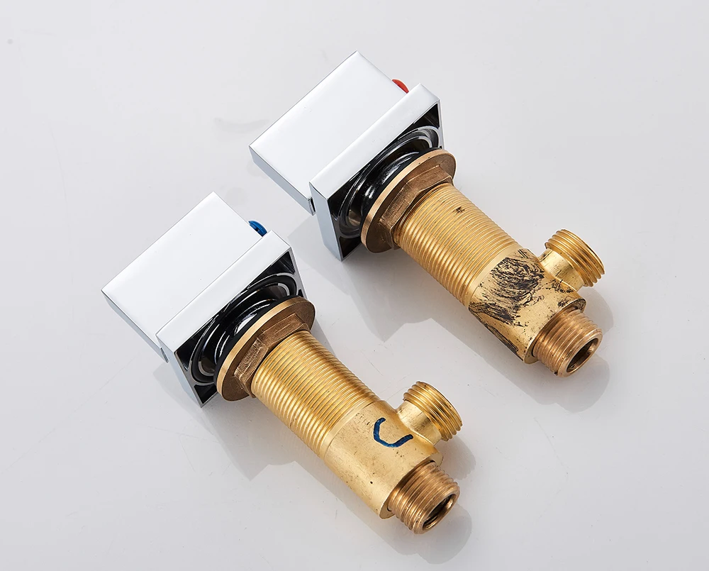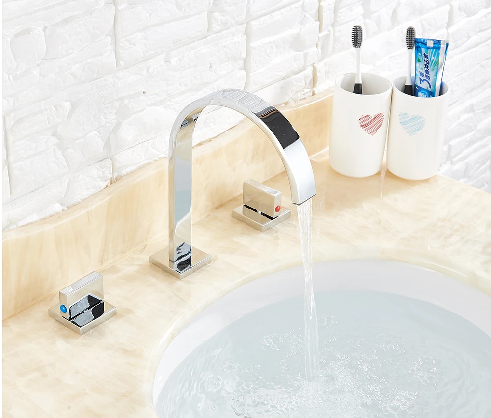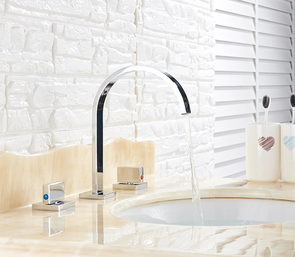 Robinets de lavabo en chrome poli Robinets d’évier de salle de bain carrés montés sur le pont Double poignée 3 trous Robinet d’eau de bassin chaud froid
