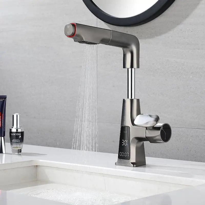 Robinet de lavabo en laiton extractible, robinets d'évier, fonction d'affichage numérique LED, robinets de salle de bains, robinet d'évier de salle de bains pour le lavage