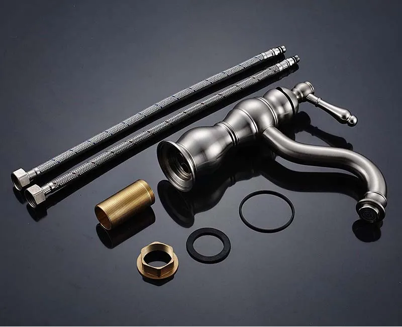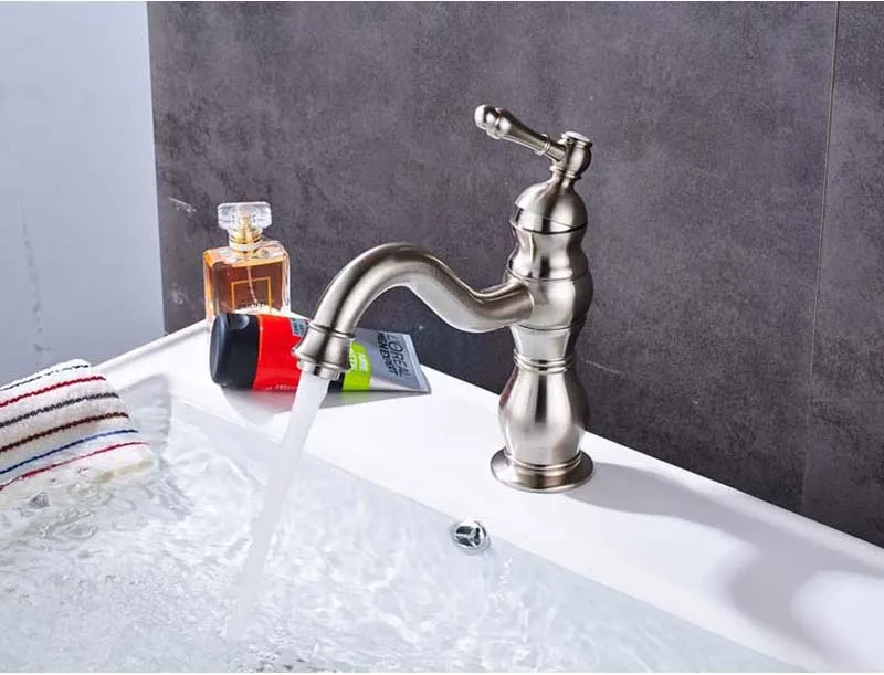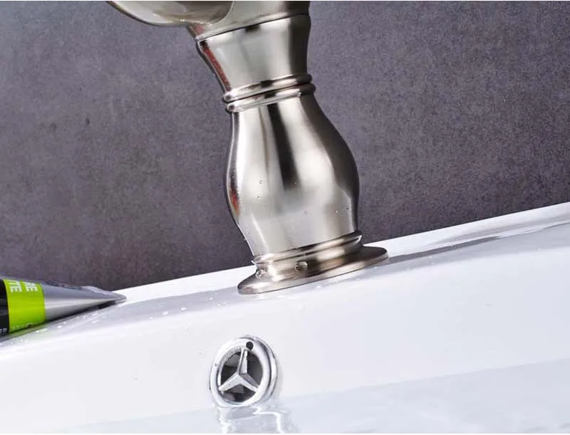 Robinet de lavabo en Nickel brossé à poignée unique, eau chaude et froide, robinet de salle de bain monté sur le pont, bec Long, robinet mitigeur de lavaboRobinet de lavabo en Nickel brossé à poignée unique, eau chaude et froide, robinet de salle de bain monté sur le pont, bec Long, robinet mitigeur de lavabo
