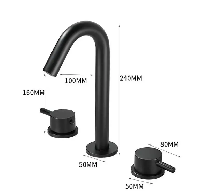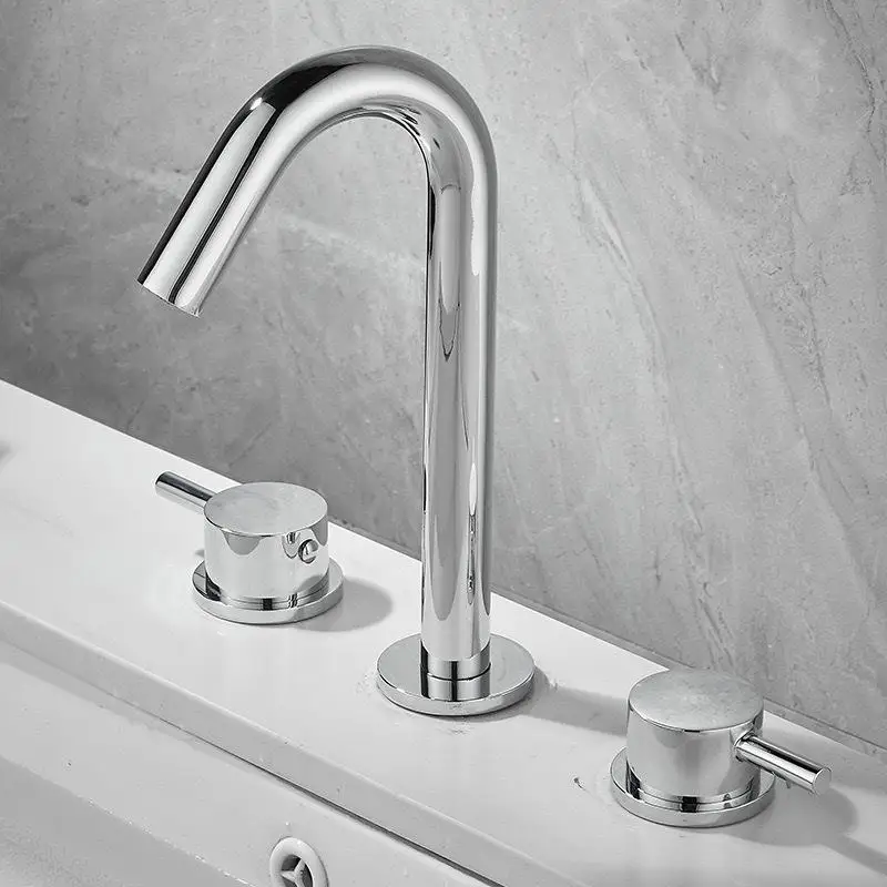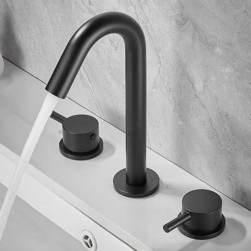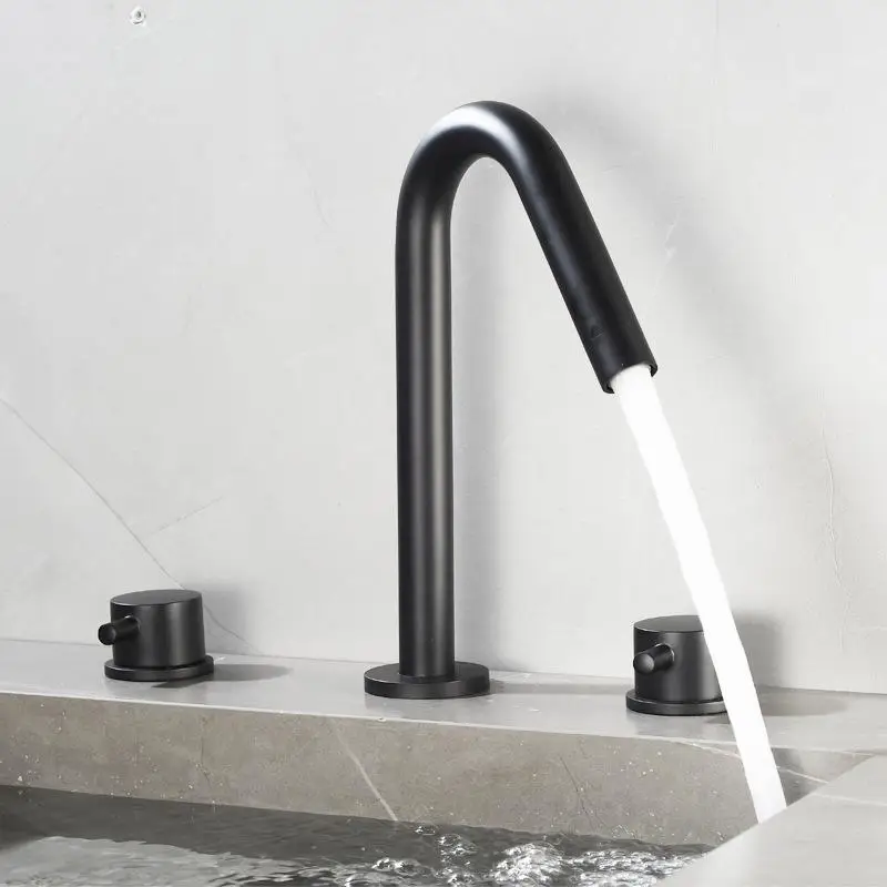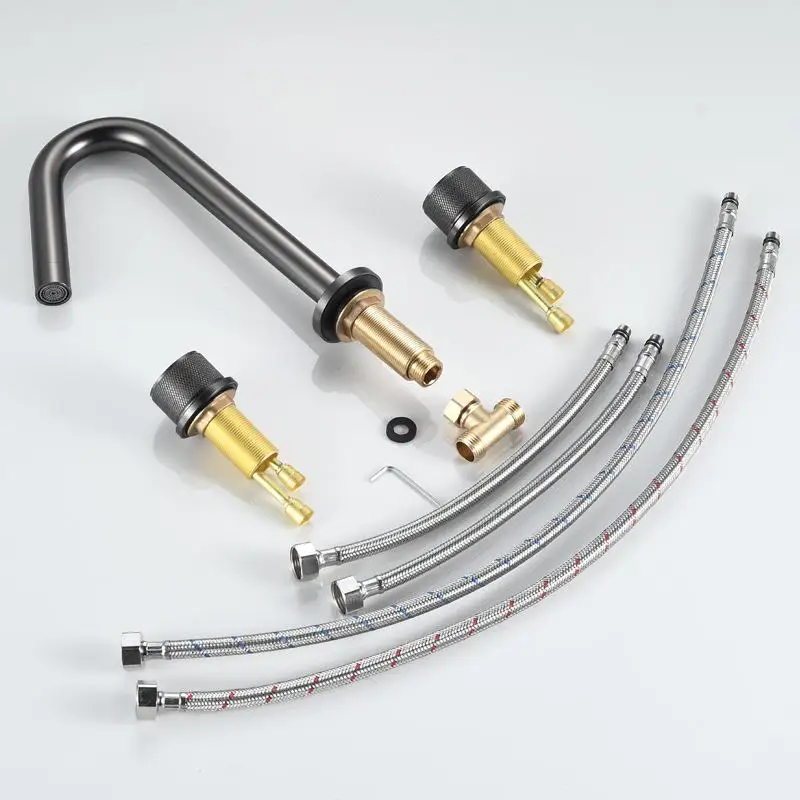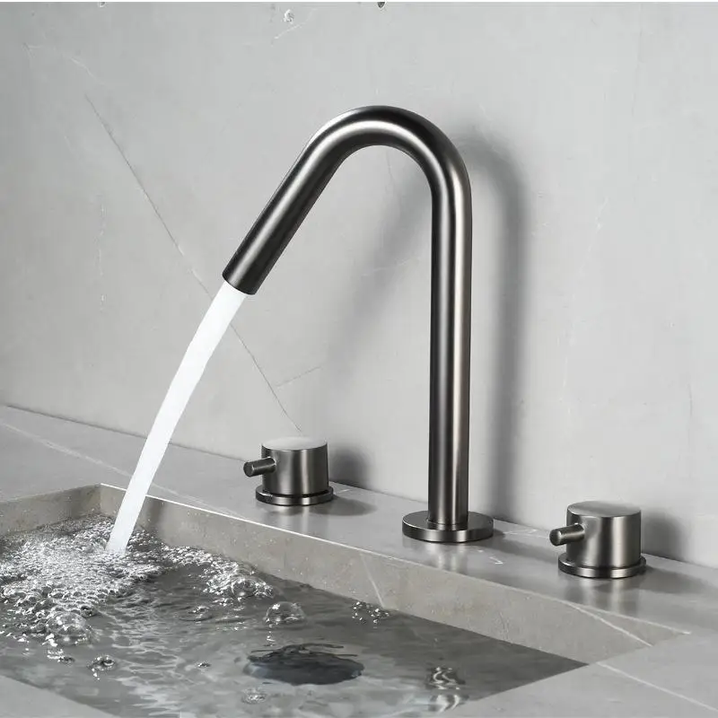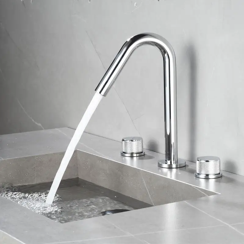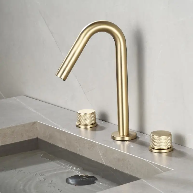 Robinet de lavabo en or brossé, robinet chaud et froid pour salle de bains, conception moletée, 2 poignées, 3 trous, mélangeur d’évier monté sur bureau, 360 ° Bec de rotation