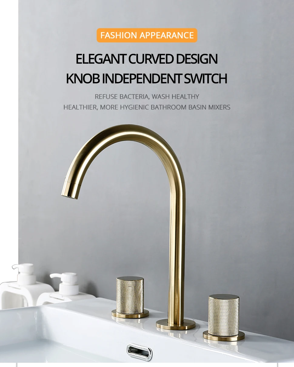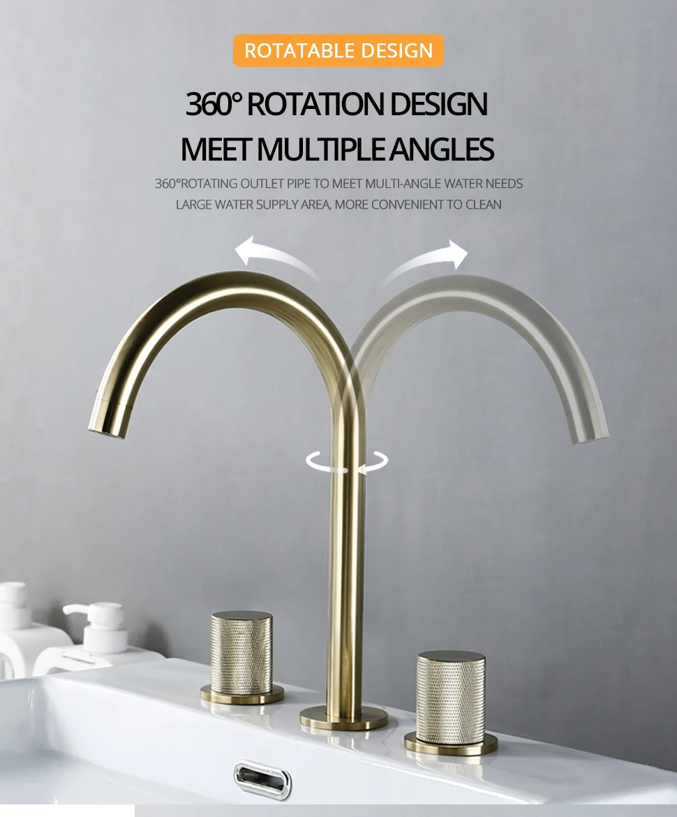 Robinet de lavabo en or brossé, robinet chaud et froid de salle de bains, conception moletée, mélangeur d'évier à Double poignée monté sur le bureau, bec rotatif à 360 °