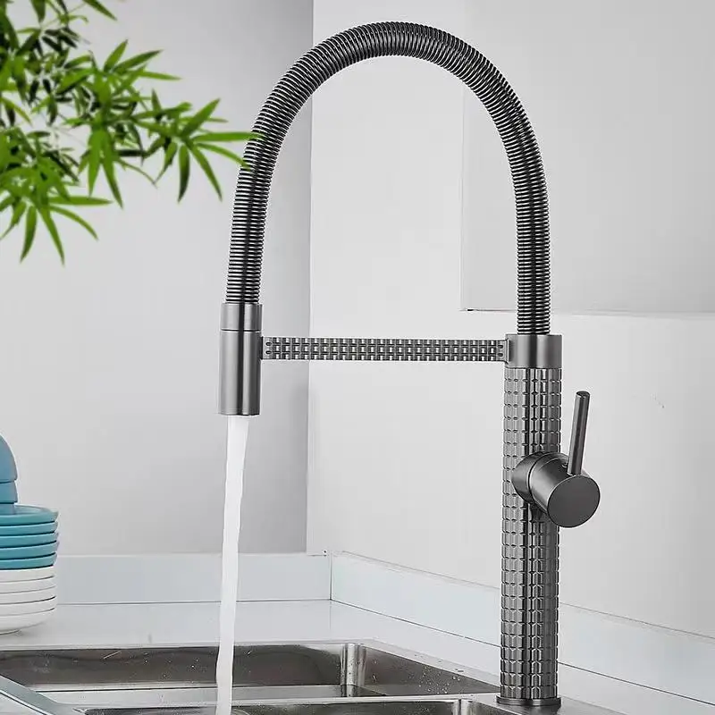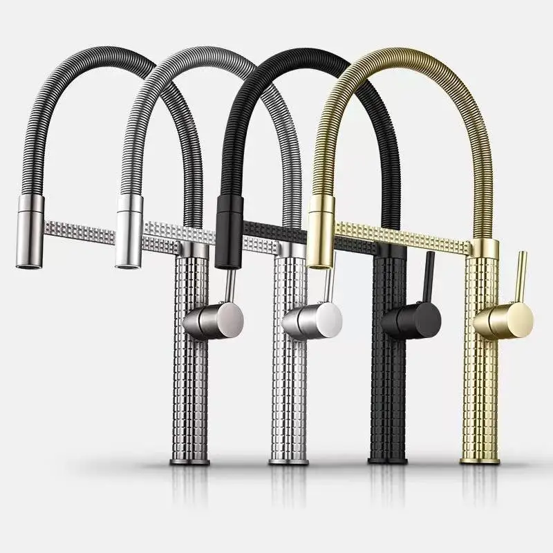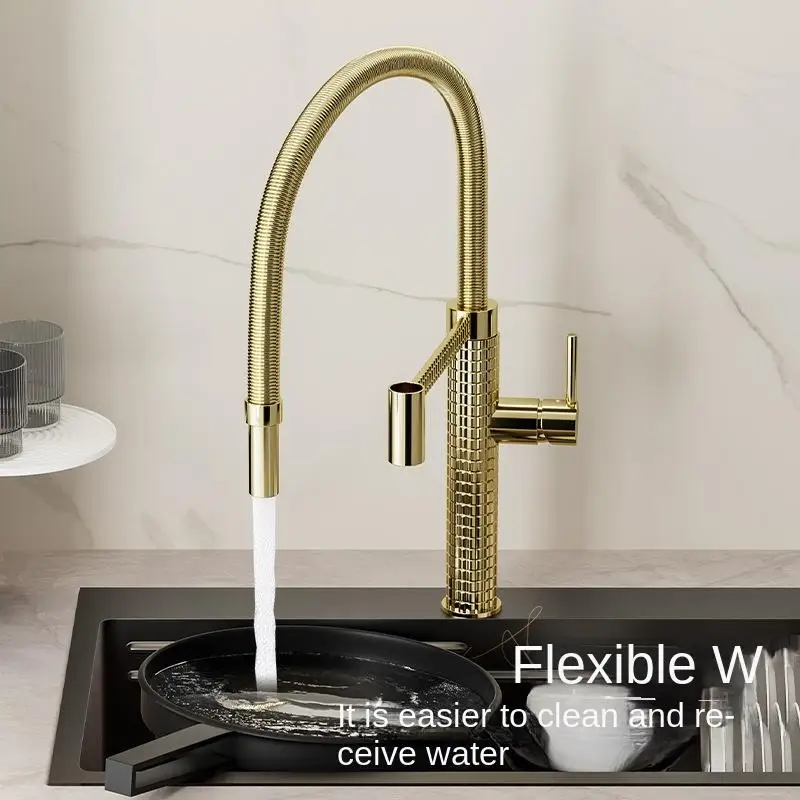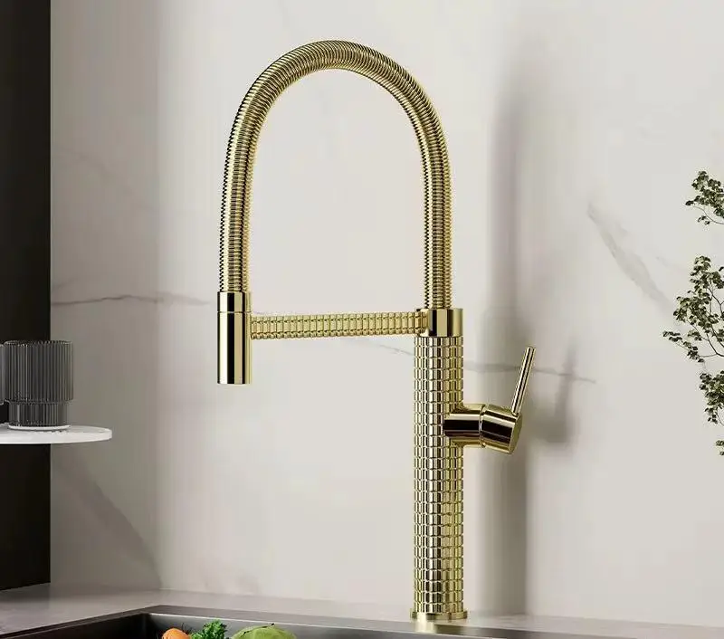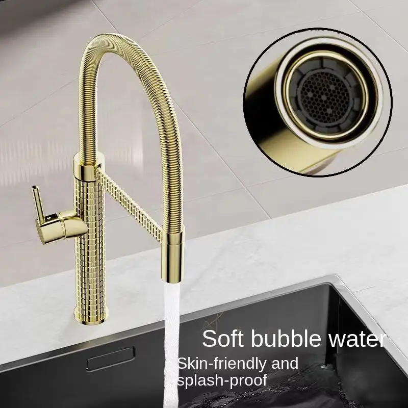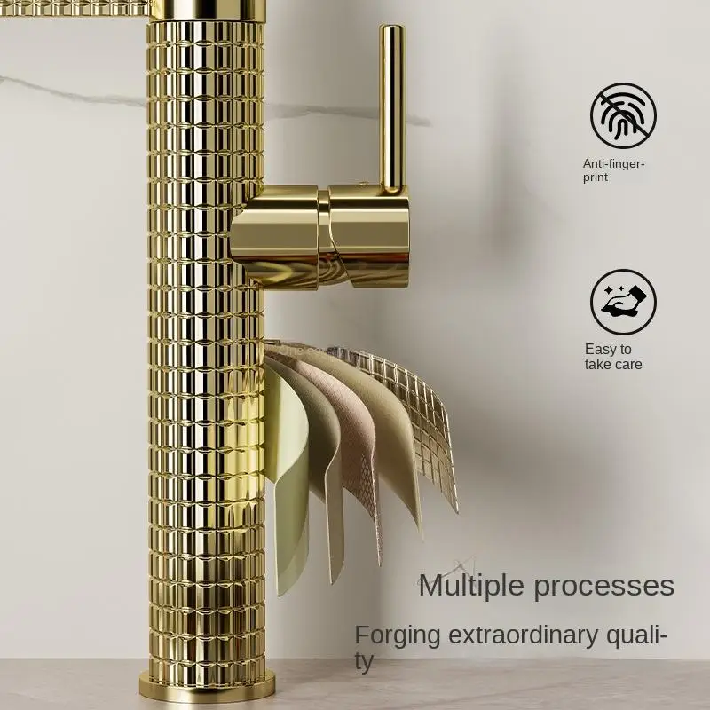 Robinet extractible à motif concave et convexe gravé haut de gamme, robinet universel à ressort, robinet de lavabo d’évier de cuisine chaud et froid