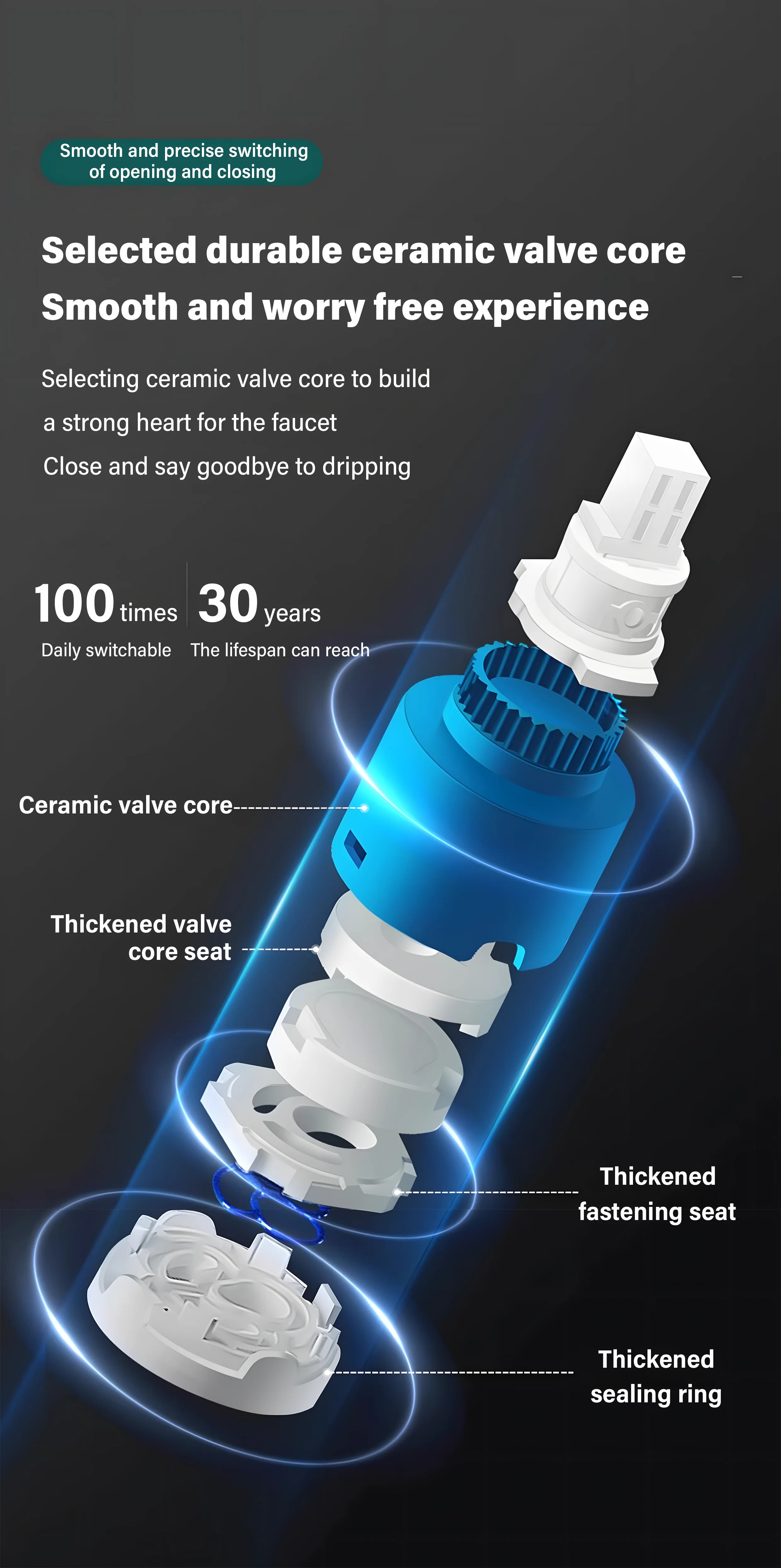 Equipé d’un noyau de valve en céramique de haute qualité, garantissant un débit d’eau et une longévité en douceur.