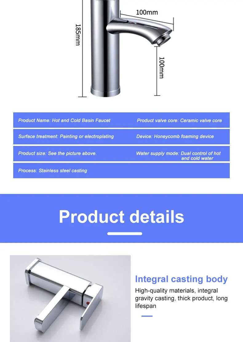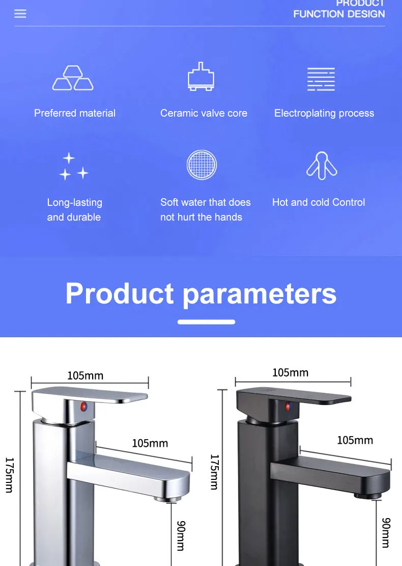 Décharge d’eau douce : barboteur en nid d’abeille en maille, l’eau du robinet est filtré à plusieurs couches sans éclaboussures. Commande ergonomique interrupteur marche/arrêt qui pousse vers le haut pour distribuer l’eau. Peut être connecté à une entrée ou deux entrées, eau chaude à gauche, eau froide à droite, pratique à utiliser. Poignée unique, robinet de salle de bain monotrou.