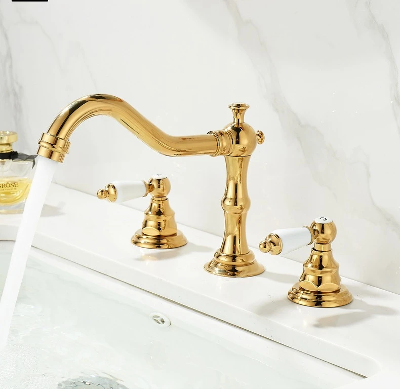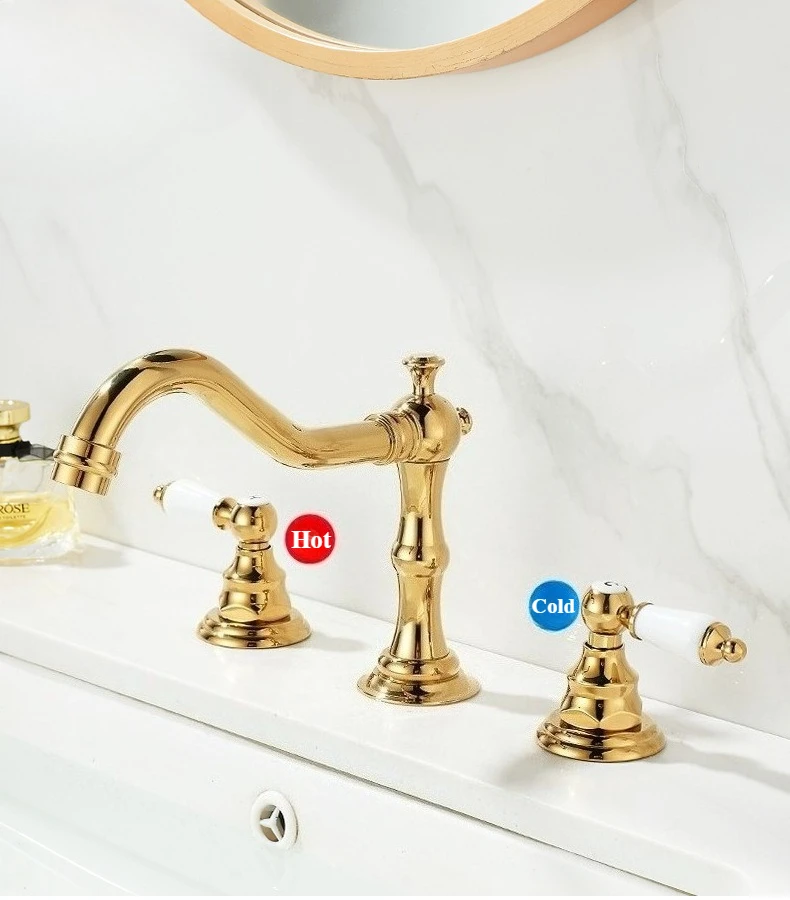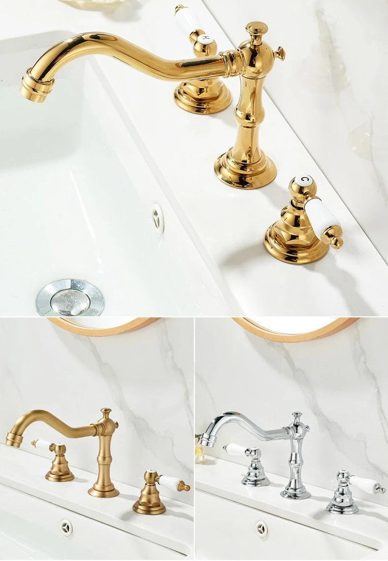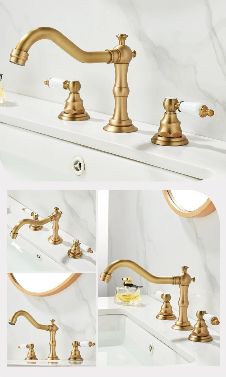 Robinet d'eau chaude et froide de luxe, robinet de lavabo à trois trous et Double poignée pour évier de salle de bains, laiton massif de Style Antique |