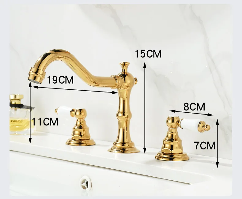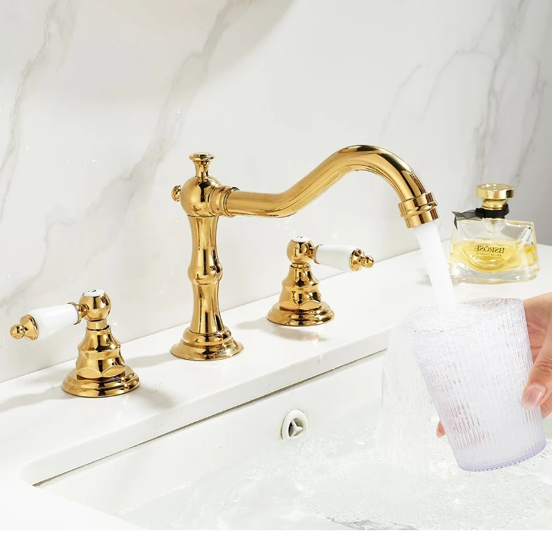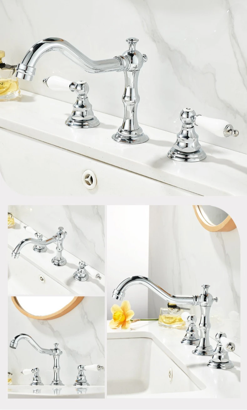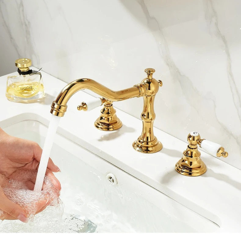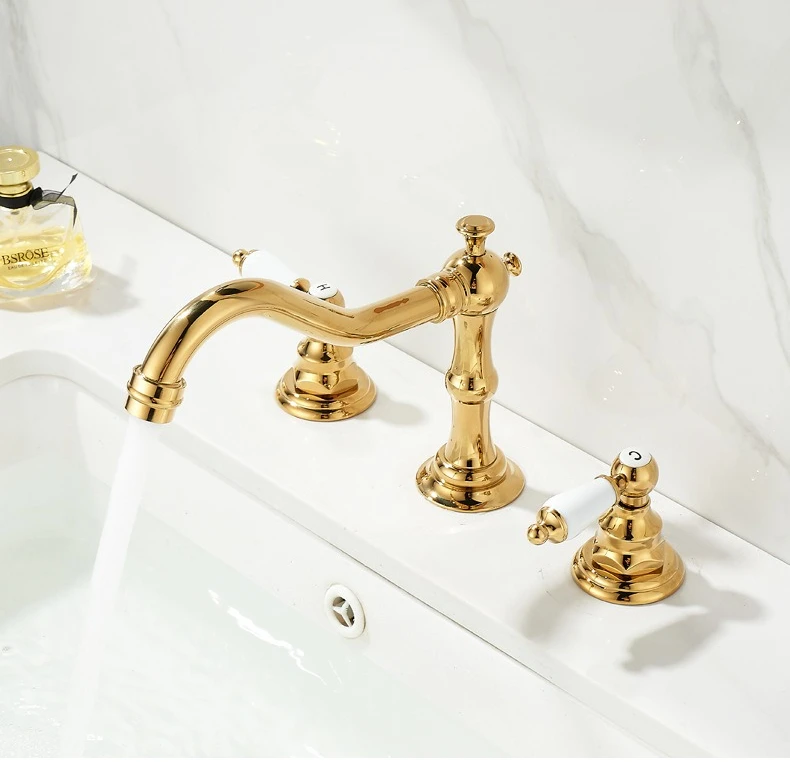 Robinet d'eau chaude et froide de luxe, robinet de lavabo à trois trous et Double poignée pour évier de salle de bains, laiton massif de Style Antique |