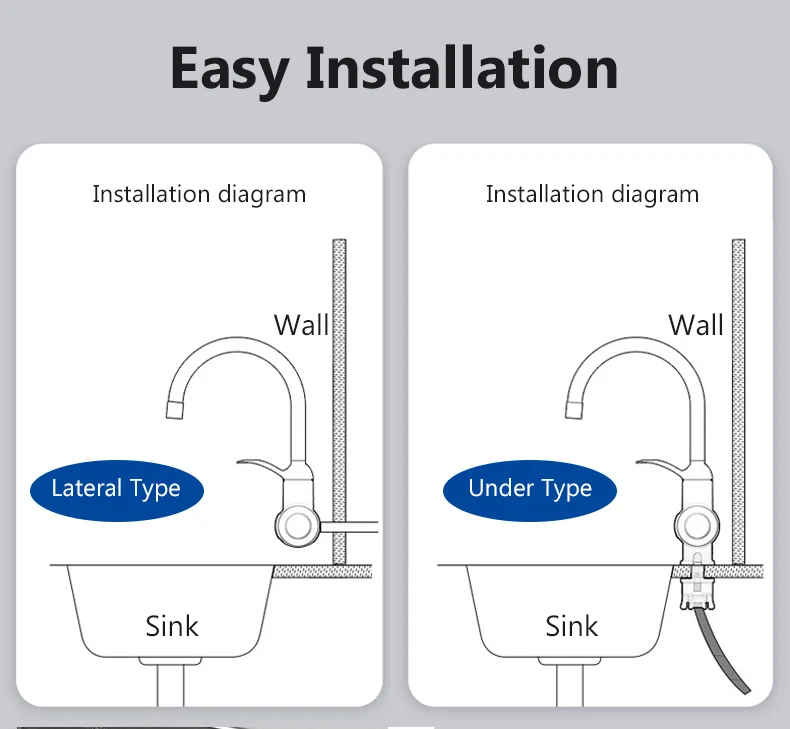 The Under type needs to be installed upright on the sink; the Lateral type needs to be installed on the wall.
