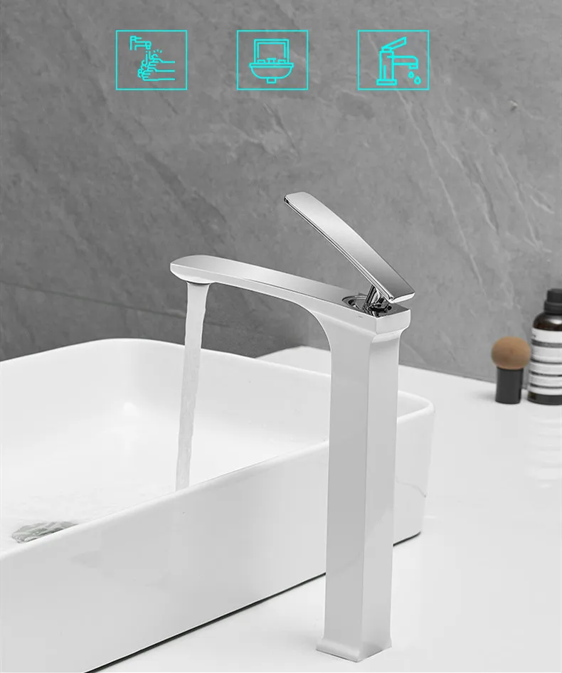 Choisissez un robinet haut (25-35 cm) pour que le bec passe au-dessus de la vasque. Portée recommandée : 12-18 cm.