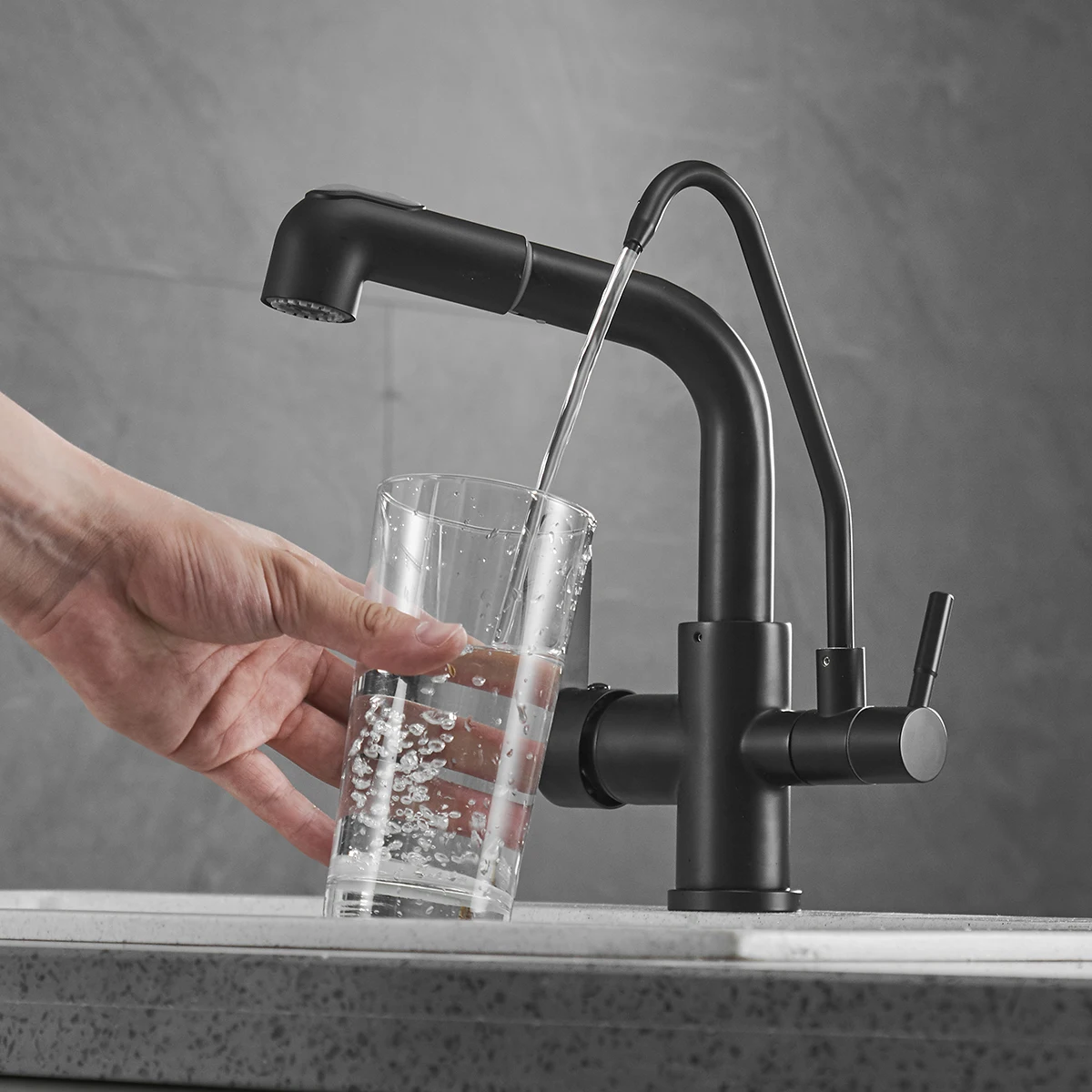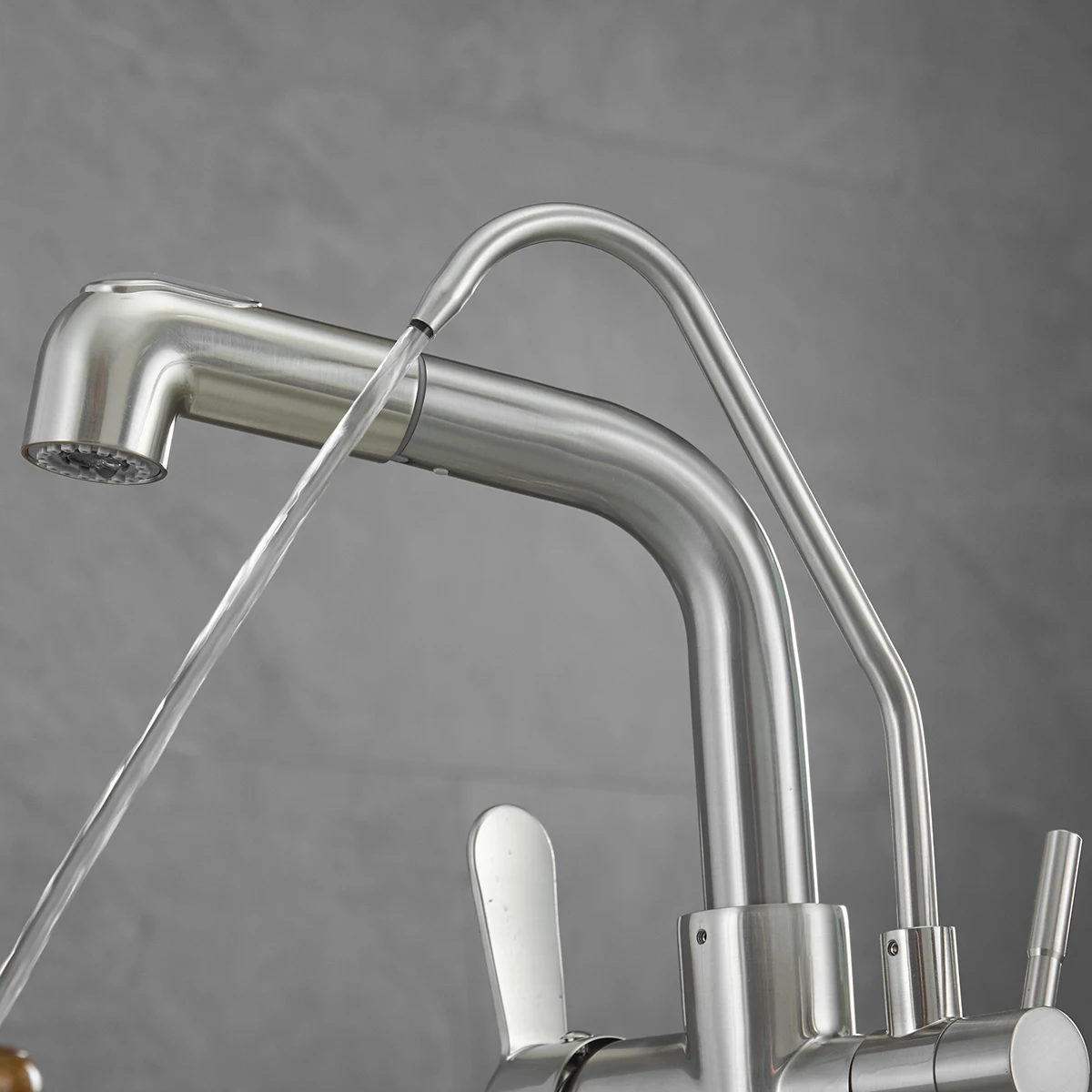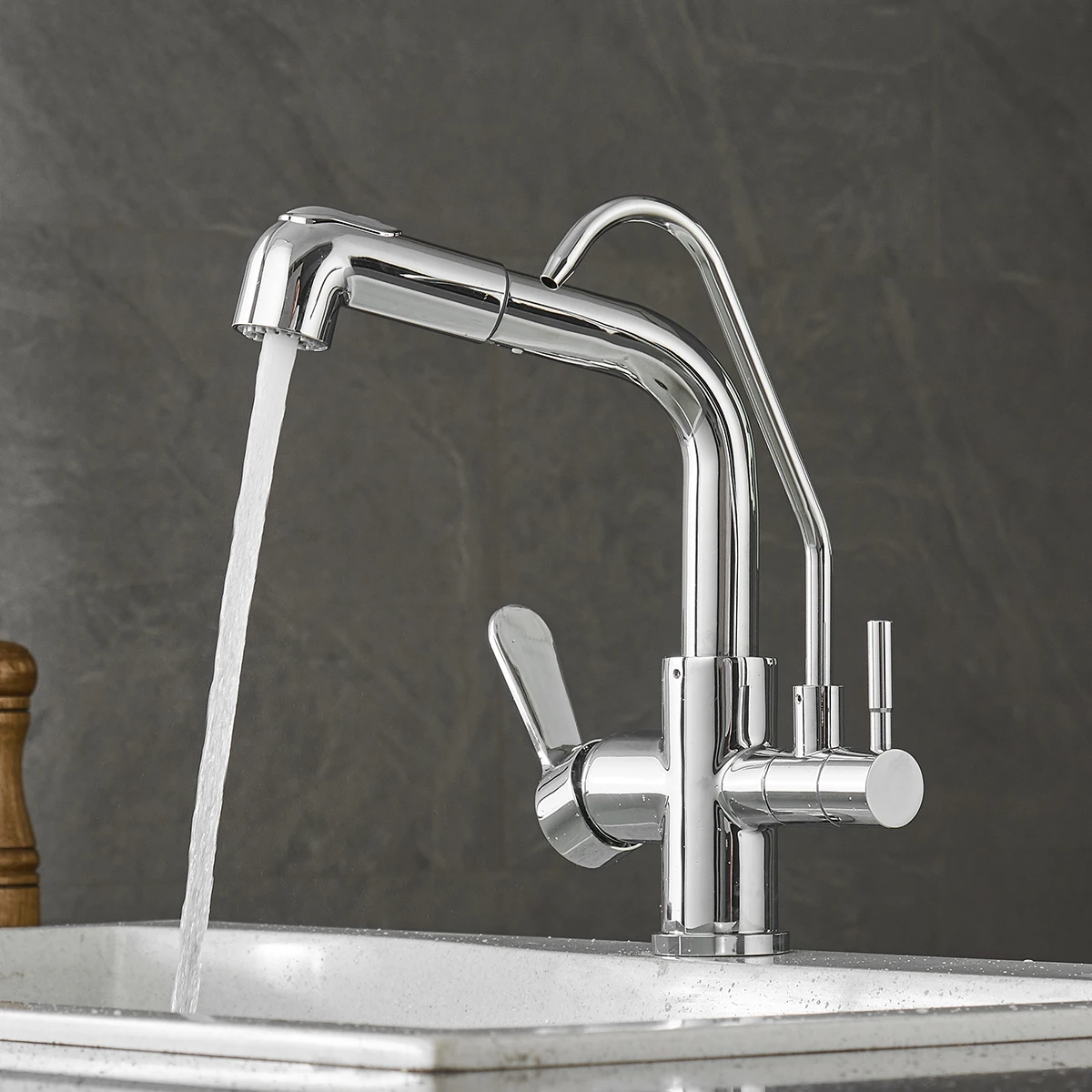 Reliable and High Quality Material: Constructed with stainless steel, this kitchen faucet with filtered water dispenser is built to last, resisting corrosion and ensuring long-term reliability for your kitchen sink. The pull-down faucet design adds flexibility and ease of use, making everyday tasks like filling pots or washing dishes a breeze