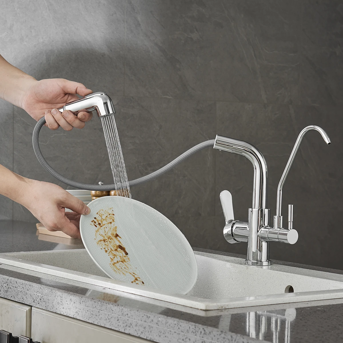 Three-Function Sprayer & Filter Faucet: Enjoy the convenience of a three-function sprayer with the Kitchen Faucet, allowing you to easily switch between regular water flow and a powerful spray for efficient cleaning. The filter faucet feature provides you with peace of mind, knowing that your water is always clean and safe for consumption