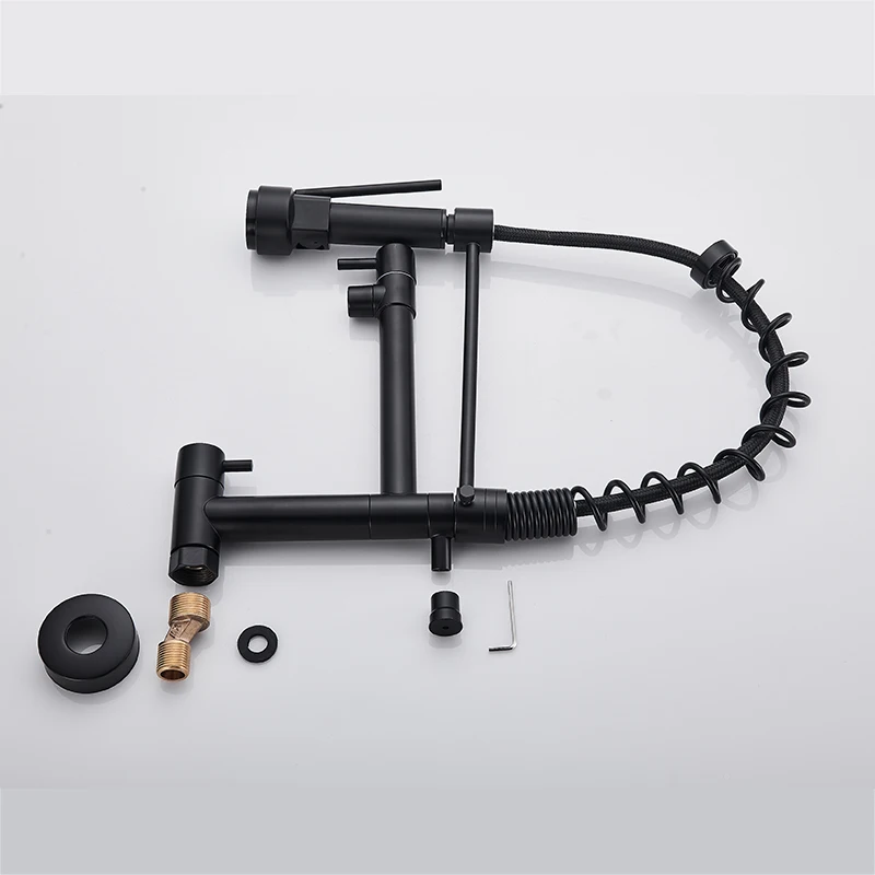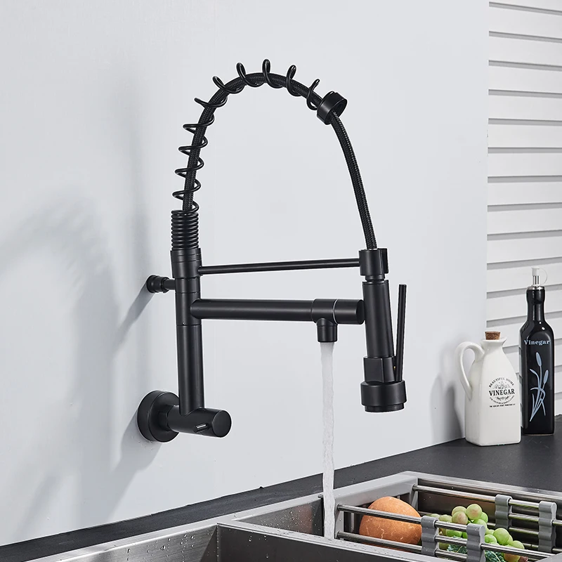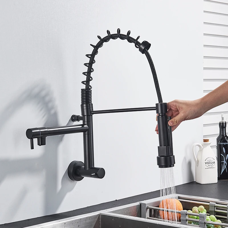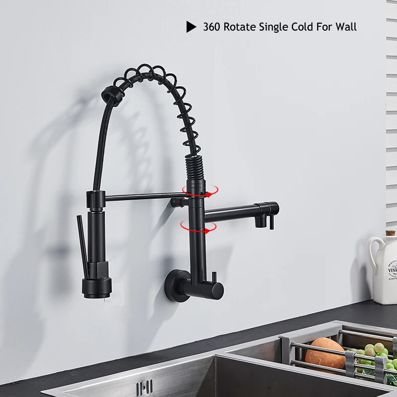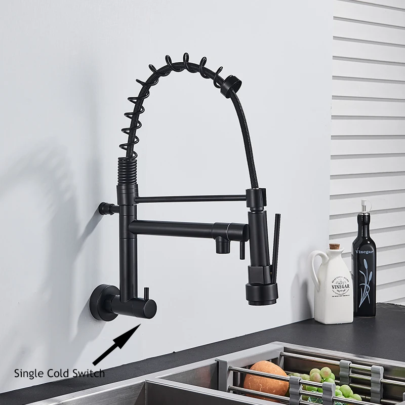 Robinet d’évier de cuisine noir mat, montage mural à ressort, double bec d’eau, pulvérisateur extractible, robinet d’eau froide unique de cuisine, grue
