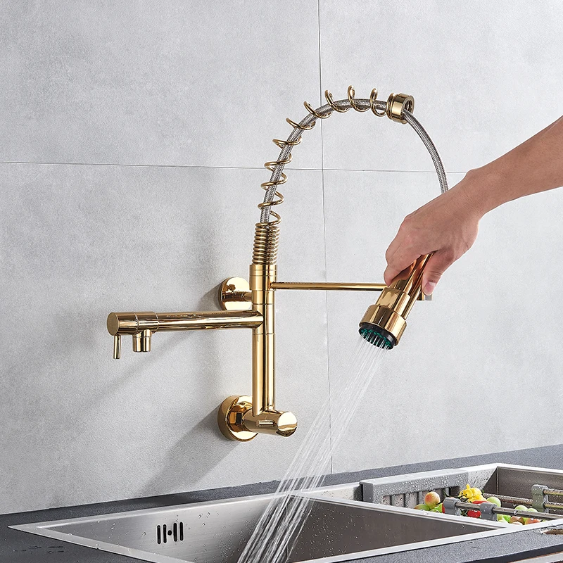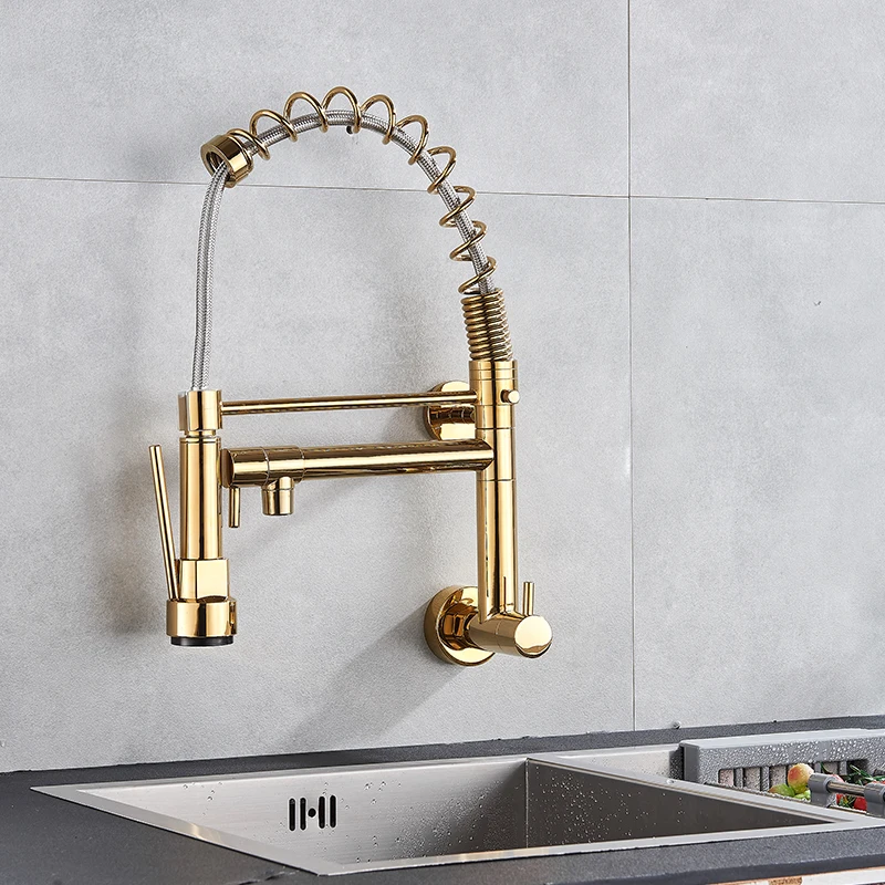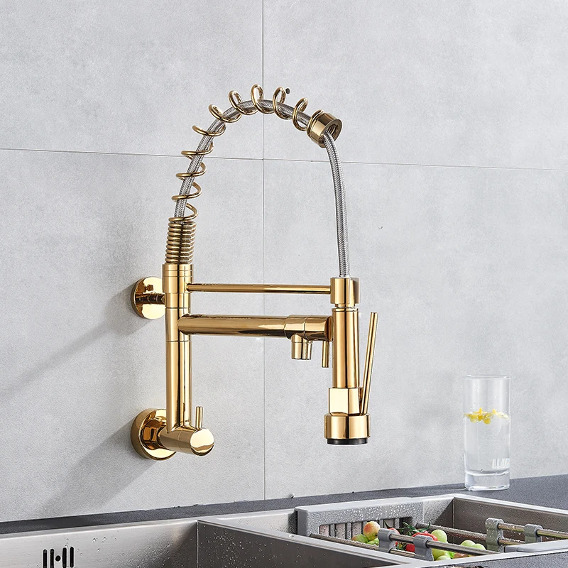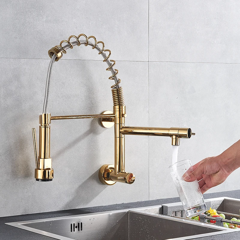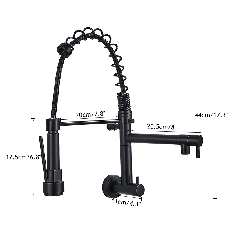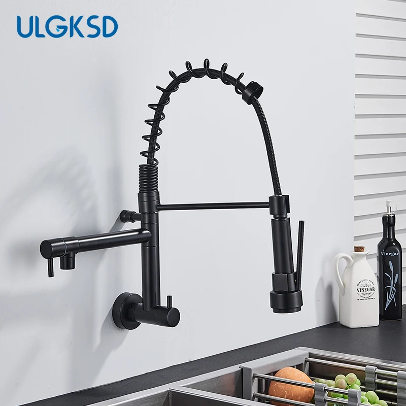 Robinet d’évier de cuisine noir mat, montage mural à ressort, double bec d’eau, pulvérisateur extractible, robinet d’eau froide unique de cuisine, grue