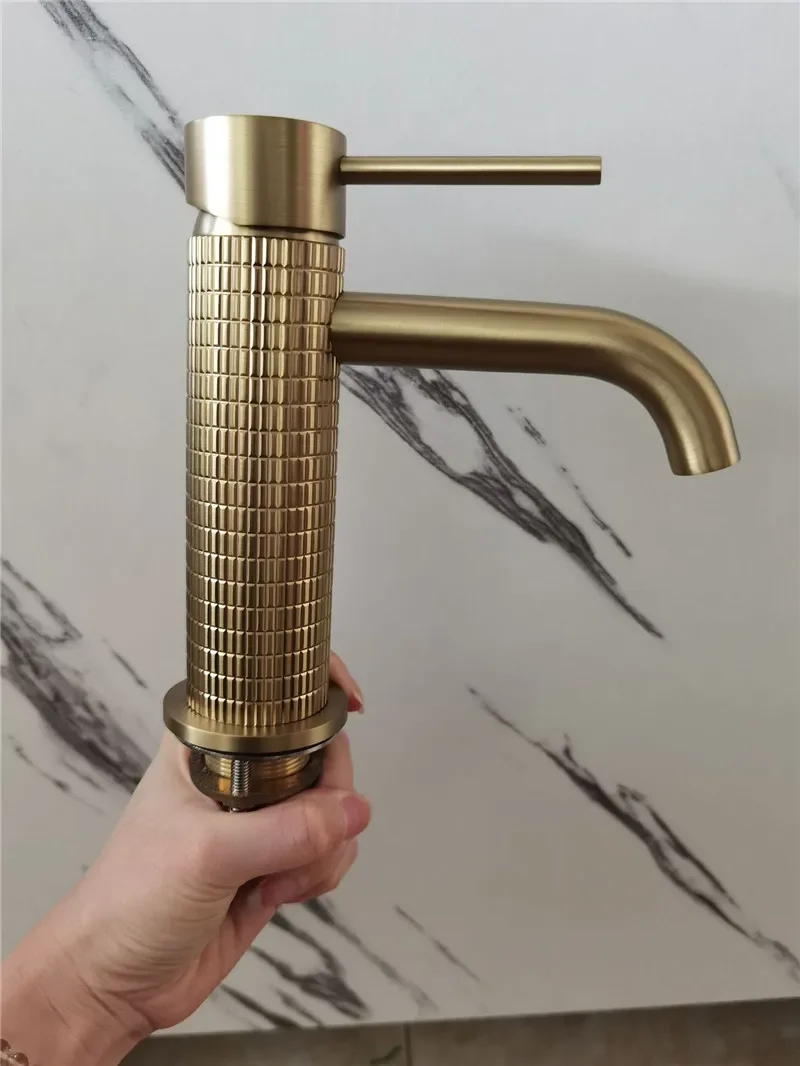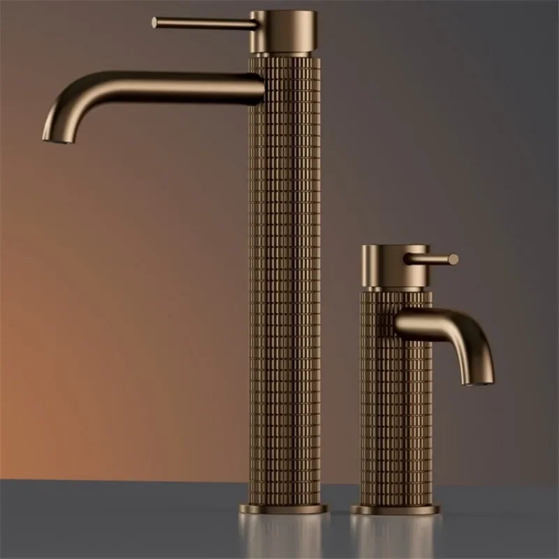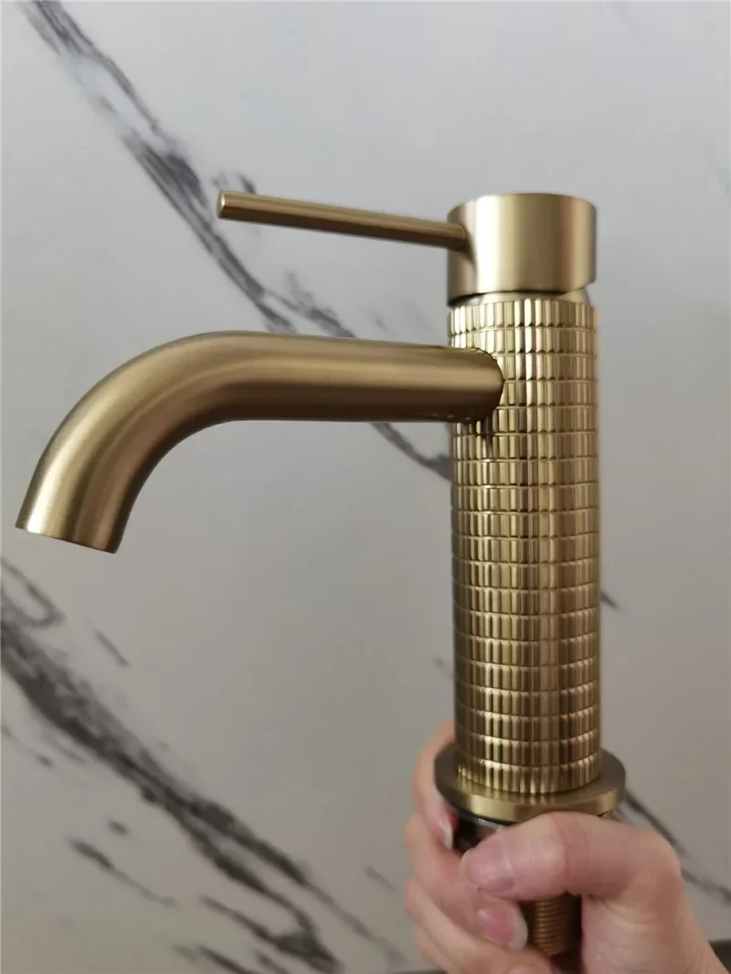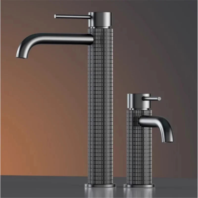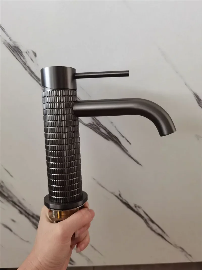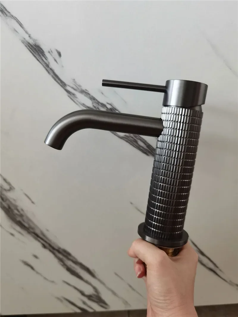 Robinet de salle de bains en or rose brossé Robinet de lavabo en or brossé Robinet d’évier sculpté Art Robinet de lavabo gris chaud et froid Robinet d’eau de grue