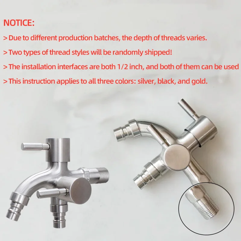 1 * robinet bidirectionnel en acier inoxydable, 1 * couvercle décoratif, 1 * ruban PTFE