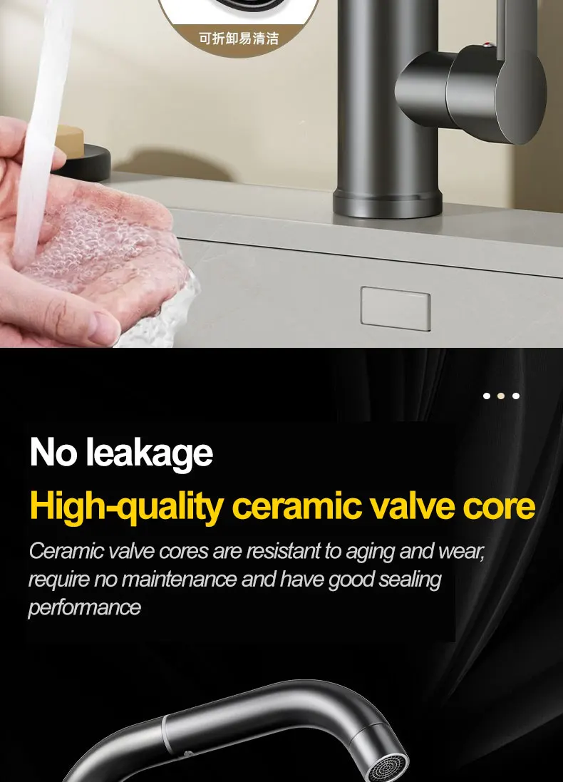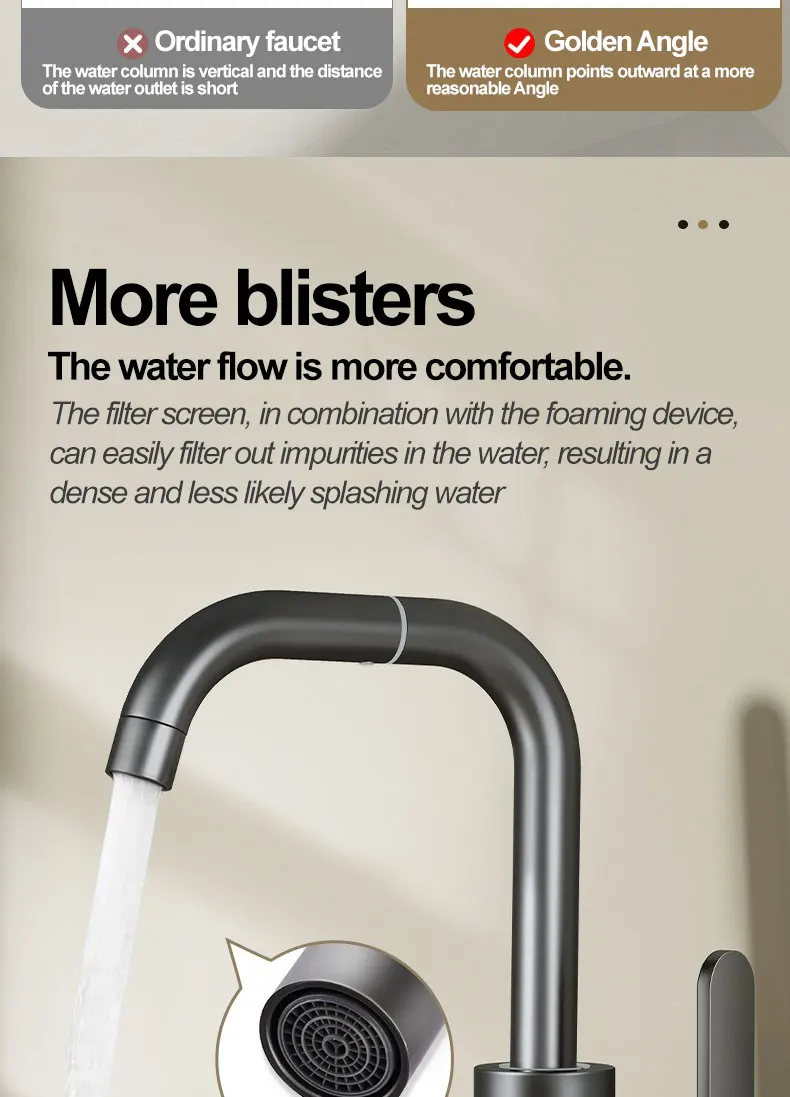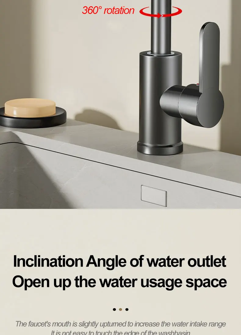 2.Angle d’inclinaison de sortie d’eau Ouvrir l’espace d’utilisation de l’eau La bouche du robinet est légèrement dévouée pour augmenter la plage d’admission d’eau Il n’est pas facile de toucher le bord du lavabo