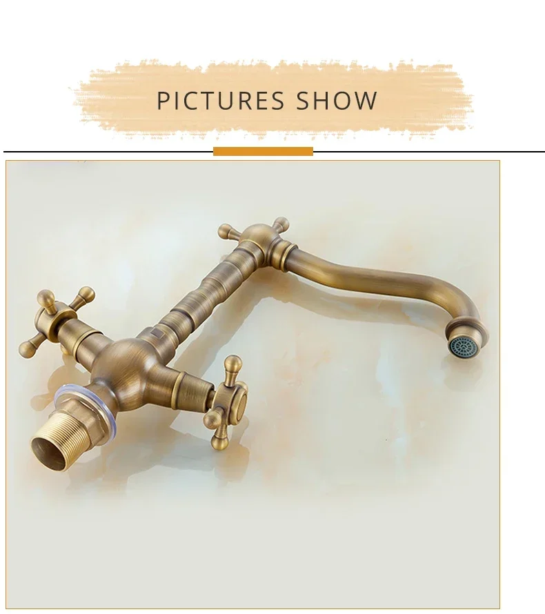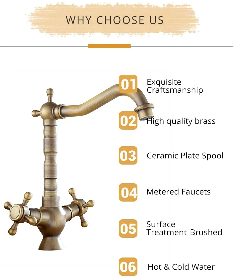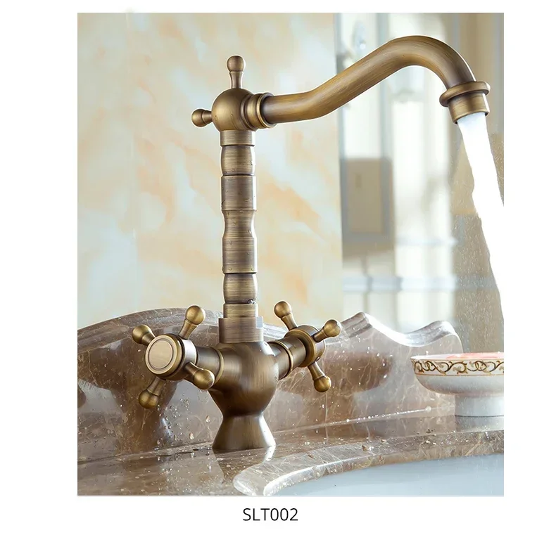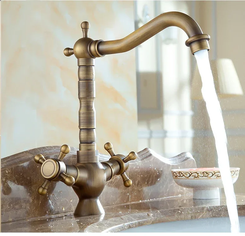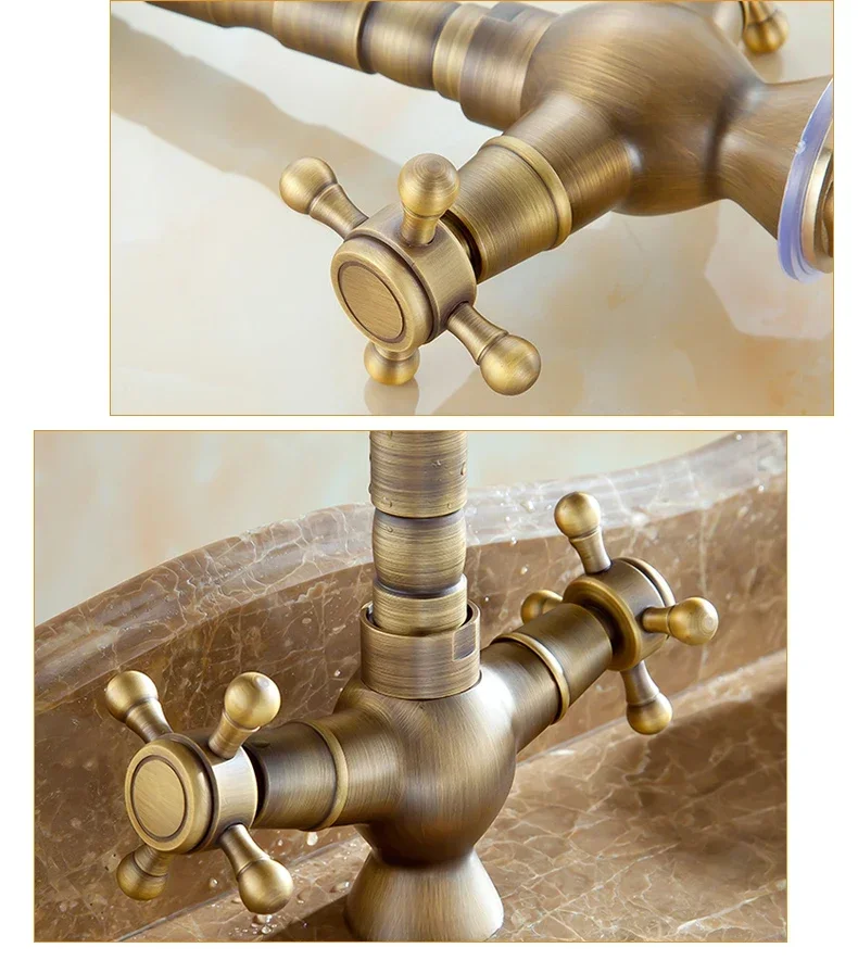 Robinet de lavabo à deux poignées Robinets mitigeurs en laiton fini bronze Rotation à 360 ° Robinet d’évier de bain antique Robinets d’eau montés sur le pont