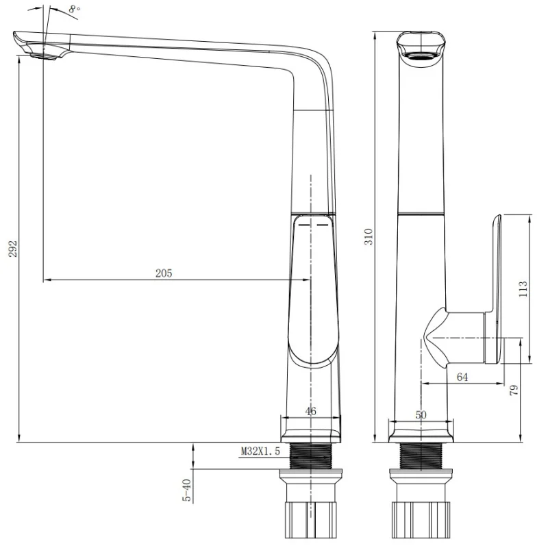 Un robinet standard (15-25 cm) convient parfaitement. Hauteur sous bec : 10-15 cm. Installation 1 trou classique.