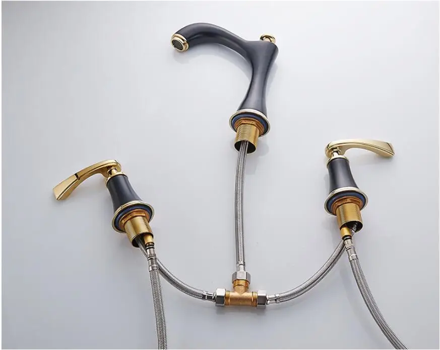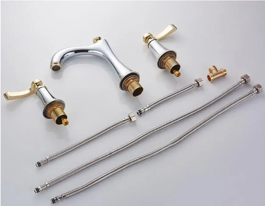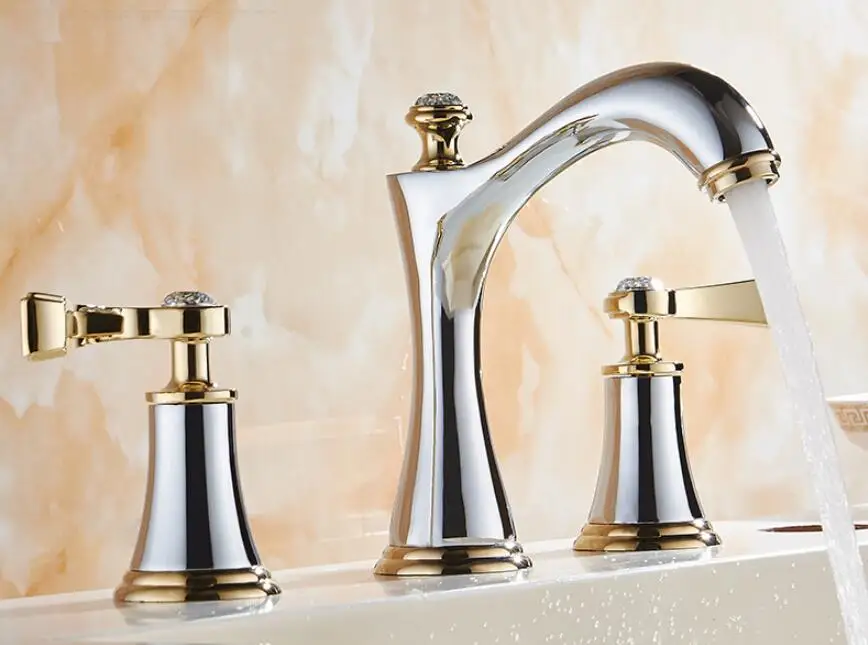 Robinets de lavabo en laiton poli Chrome or, robinets d’évier de salle de bains en cristal monté sur le pont 3 trous Double poignée robinet d’eau chaude et froide
