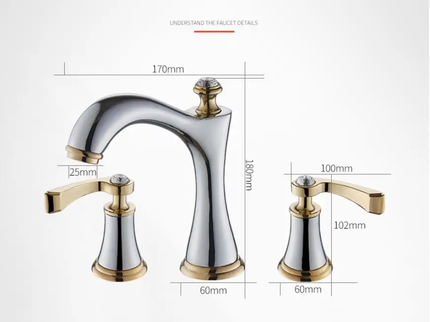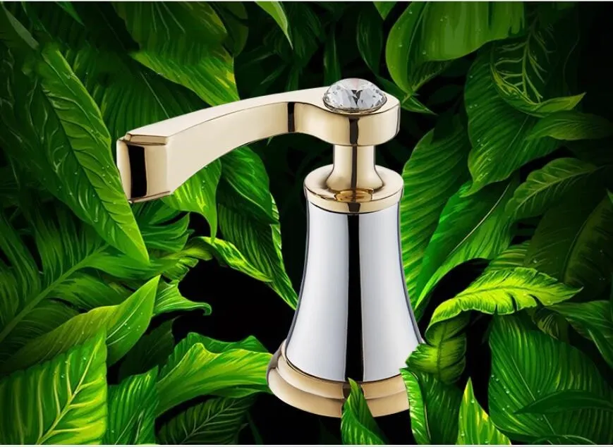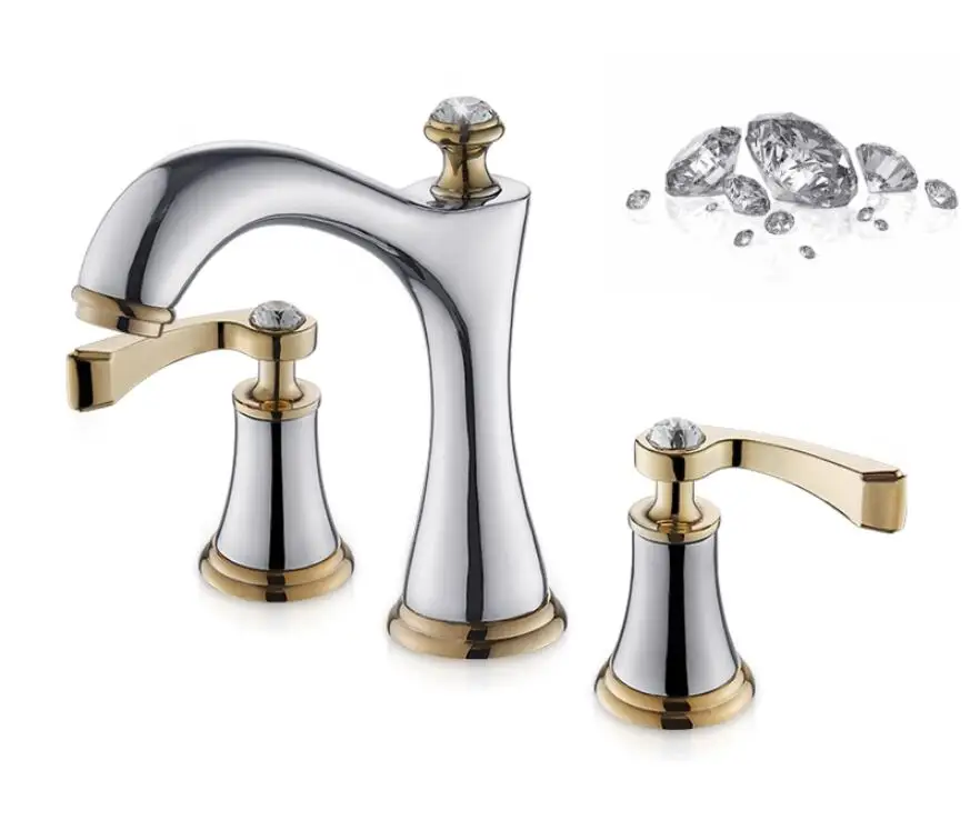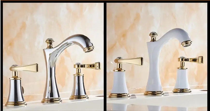 Robinets de lavabo en laiton poli Chrome or, robinets d’évier de salle de bains en cristal monté sur le pont 3 trous Double poignée robinet d’eau chaude et froideRobinets de lavabo en laiton poli Chrome or, robinets d’évier de salle de bains en cristal monté sur le pont 3 trous Double poignée robinet d’eau chaude et froide