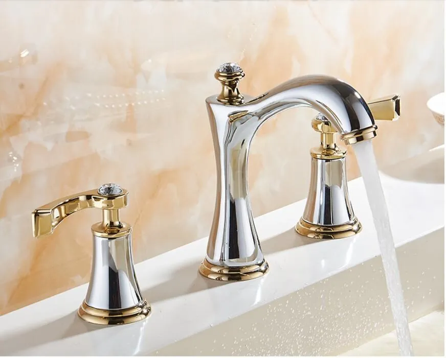 Robinets de lavabo en laiton poli Chrome or, robinets d'évier de salle de bains en cristal monté sur le pont 3 trous Double poignée robinet d'eau chaude et froide