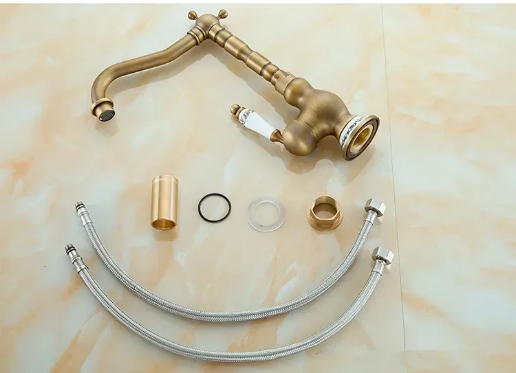 Robinets de salle de bains Robinet en bronze antique pour cuisine Robinet mitigeur de lavabo d’eau froide et chaude avec grue de robinet d’évier à poignée unique en céramique
