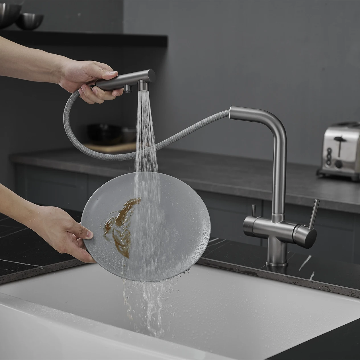 - 【Robinets de cuisine 3 en 1 : combine le robinet d’évier de cuisine et le bec du robinet d’eau potable en un, y compris les adaptateurs de connexion de système d’eau chaude et froide et de système RO, éliminant le besoin d’un robinet d’eau potable séparé, économisant de l’espace et de l’argent ;Le robinet de filtre à eau purificateur pour évier de cuisine est compatible avec la plupart des osmose inverse sous le comptoir et des systèmes de filtration simples (non inclus)