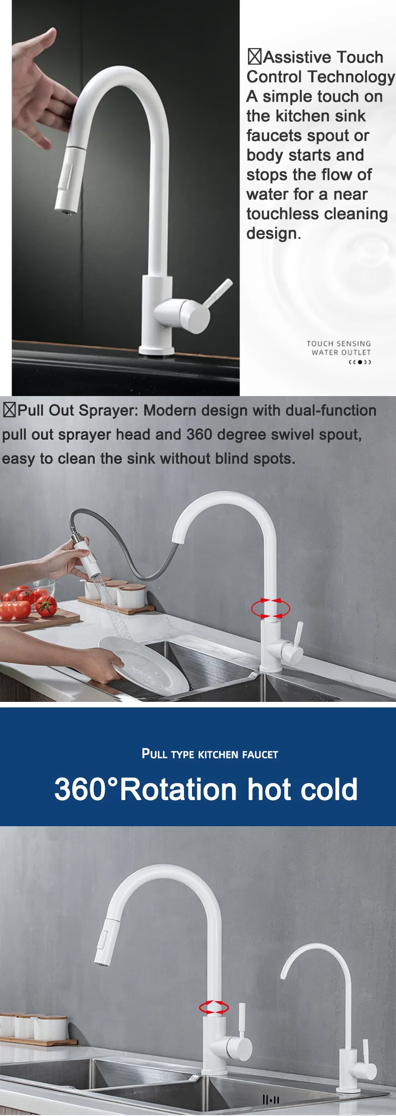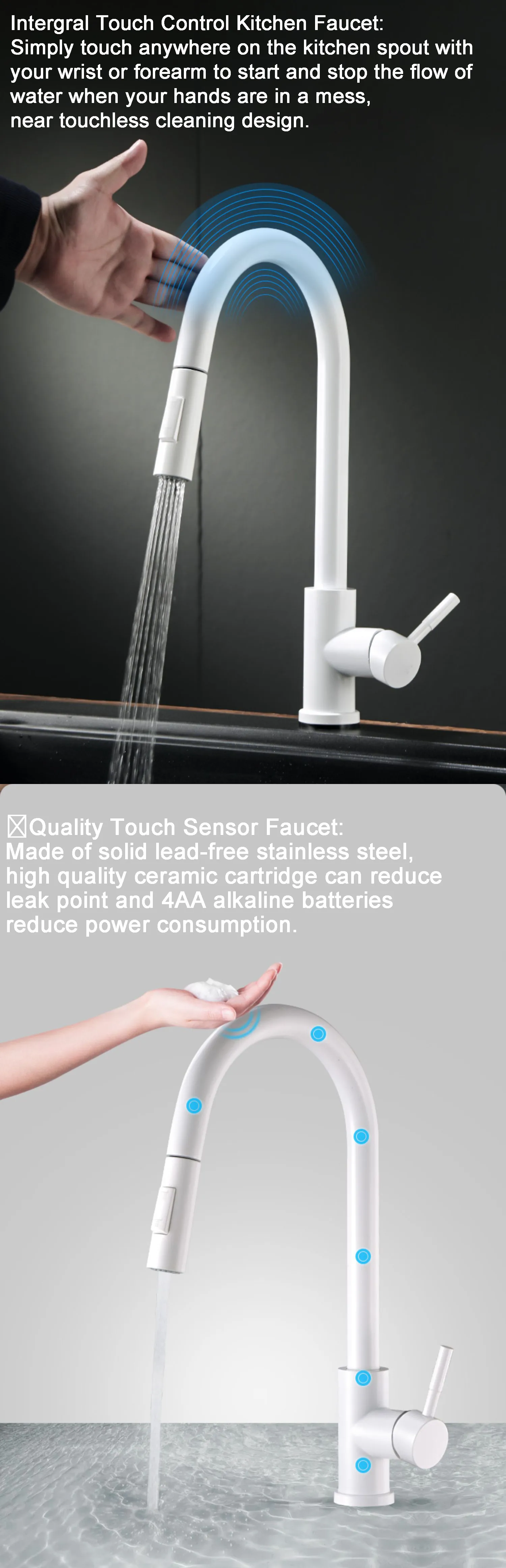 [Torneau de cuisine tactile]: La fonction tactile peut être faite par l’utiliser votre poignet, l’avant-bras ou toute autre partie du corps pour démarrer et arrêter sur le bec du robinet. Une poignée unique est utilisée pour contrôler le débit d’eau et l’eau chaude/froide manuellement. Ce sera arrêter automatiquement après 2 minutes pour éviter l’oublier pour le retourné.