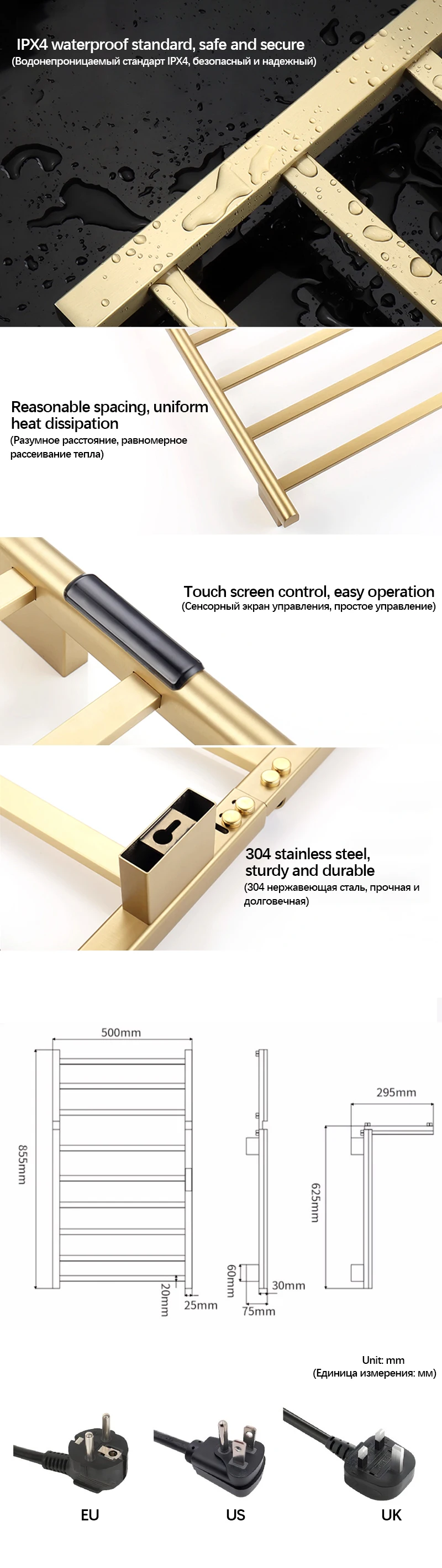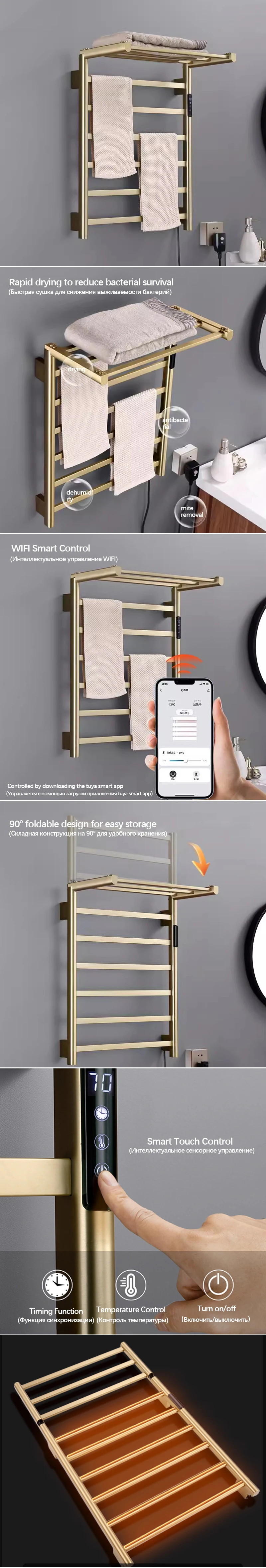 Sèche-serviettes électrique en acier inoxydable, chauffe-serviettes de salle de bain, or brossé, contrôle de la température Wifi, porte-serviettes chauffant