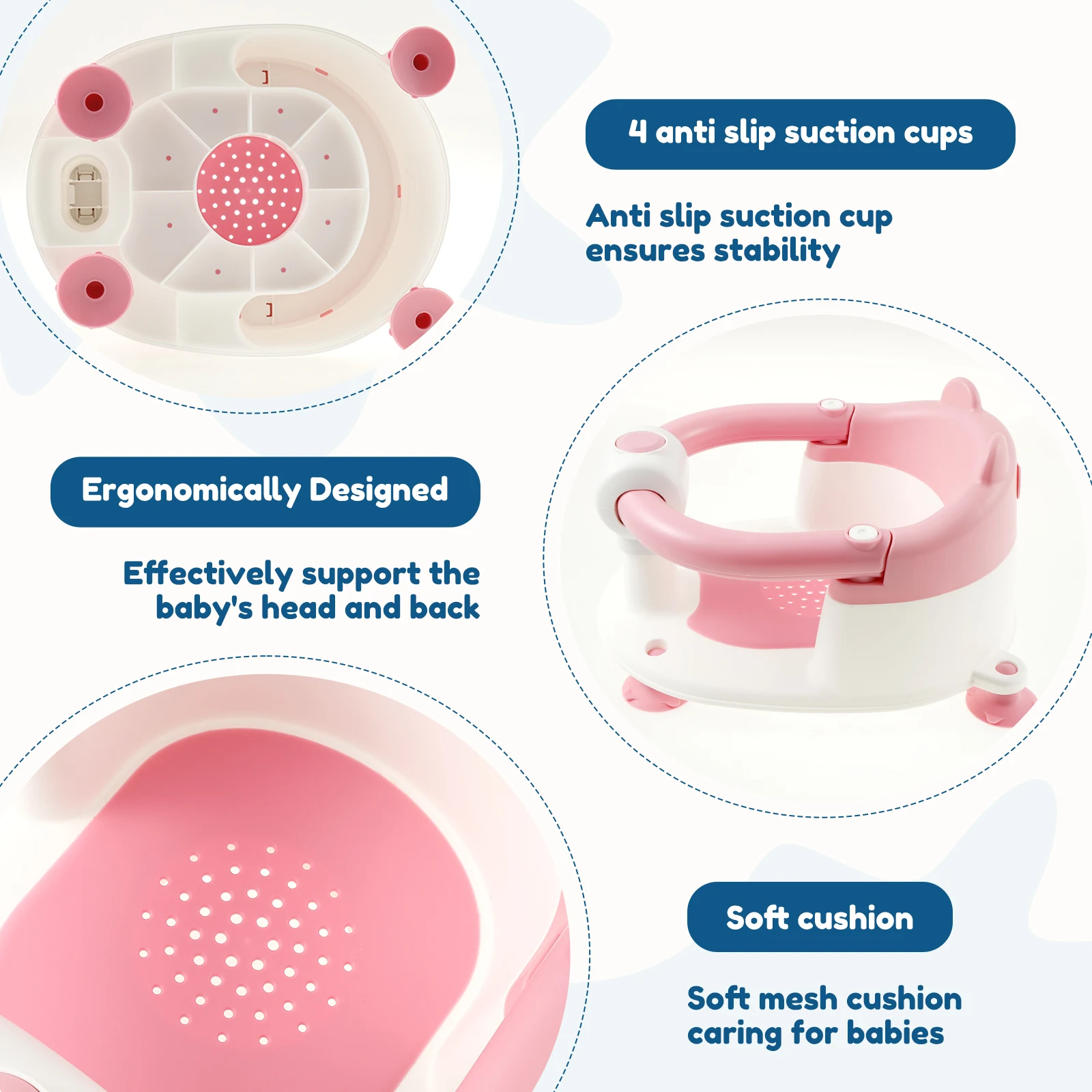 Adhesion sécurisée : La chaise de bain est équipée d’un coussin doux et respirant, offrant un confort pour le bébé.Le bas comprend quatre ventouses antidérapantes pour garantir la stabilité, le permettant d’avoir adhérent en toute sécurité pour une surface lisse et évite le glissement ou le retournement
