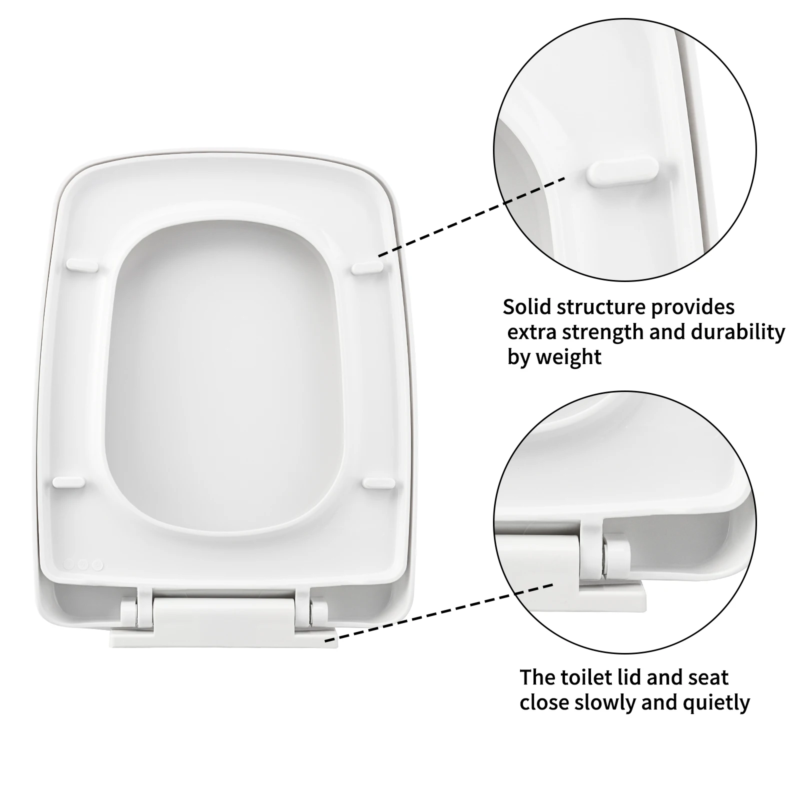 Installation simple : facile à installer et s’adapte à toutes les cuvettes de toilettes ordinaires.Il est idéal pour une utilisation familiale quotidienne dans les salles de bains résidentielles.Fermeture silencieuse : il garantit que le siège des toilettes est protégé contre les chocs ou les pincements des doigts, offrant ainsi un environnement calme pour votre famille.Construction robuste : conçue pour la stabilité et la résistance.Utilisez un matériau PP, ce siège offre un soutien et une stabilité durables.Facile à nettoyer : s’enlève rapidement et facilement pour le nettoyage ou le remplacement.Le siège de toilette améliore l’esthétique générale de votre salle de bain.Design carré : une coupe moderne pour les espaces contemporains.La forme carrée ajoute une touche élégante à vos toilettes. -