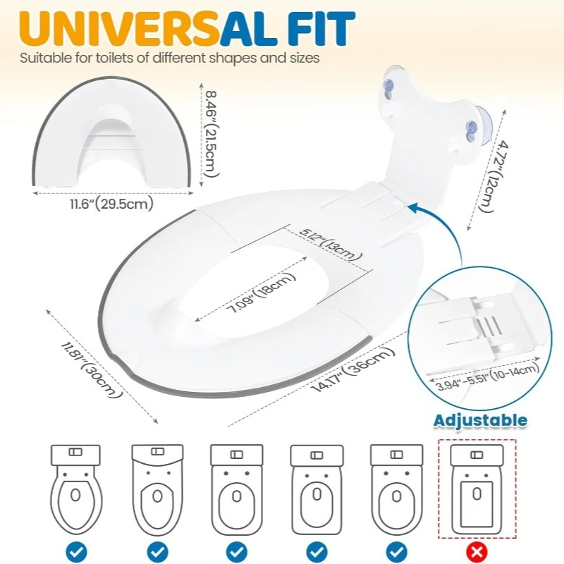 Ce siège de pot pour tout-petits a des bandes adhésives double face qui se attachent facilement au couvercle d’un siège de toilette pour adulte (conçu pour s’adapter à la plupart des sièges ronds et allongés), aucune outil requis