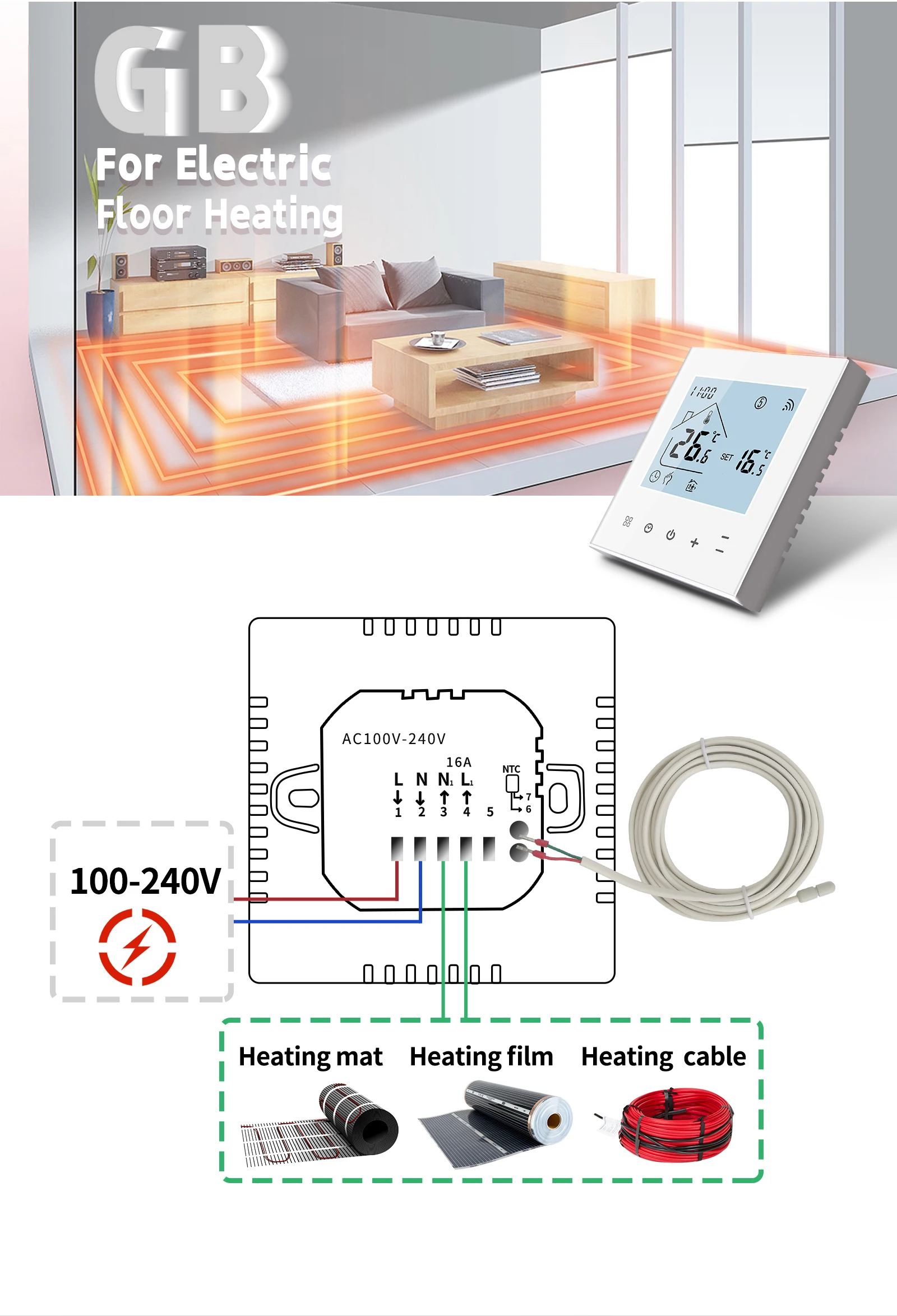 - Length of sensor cable: NTC, 10K (only for electric 16A type)