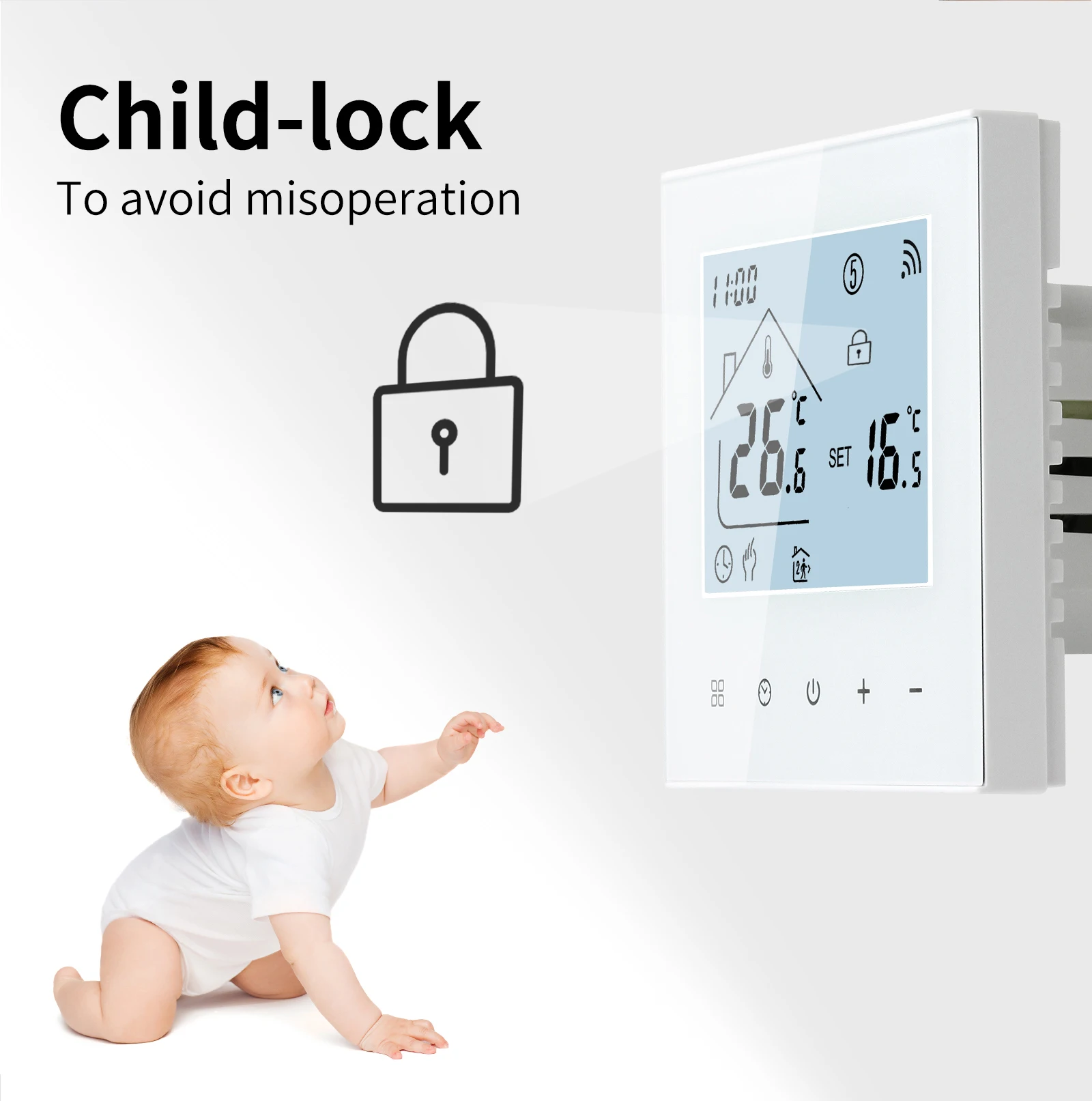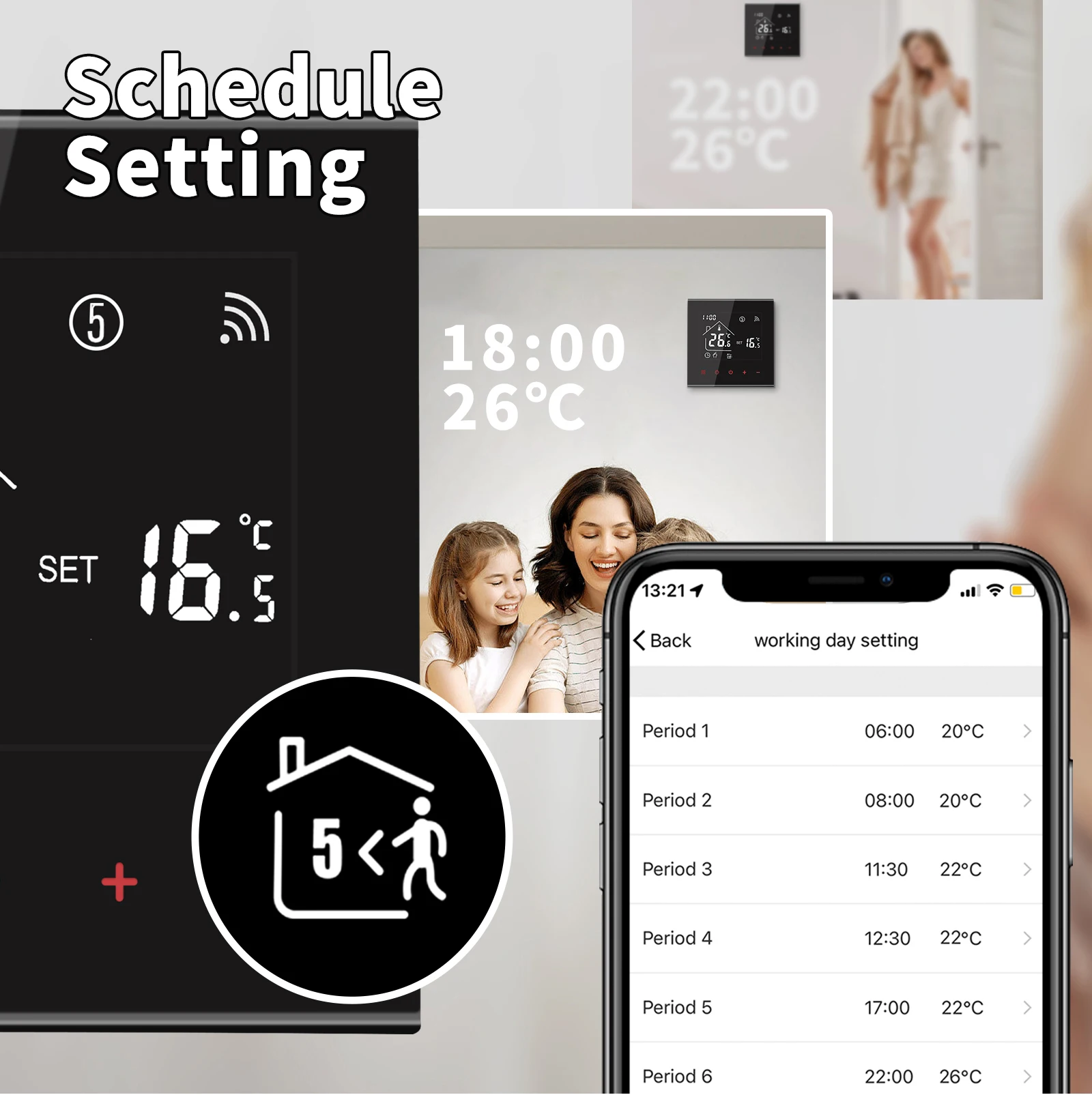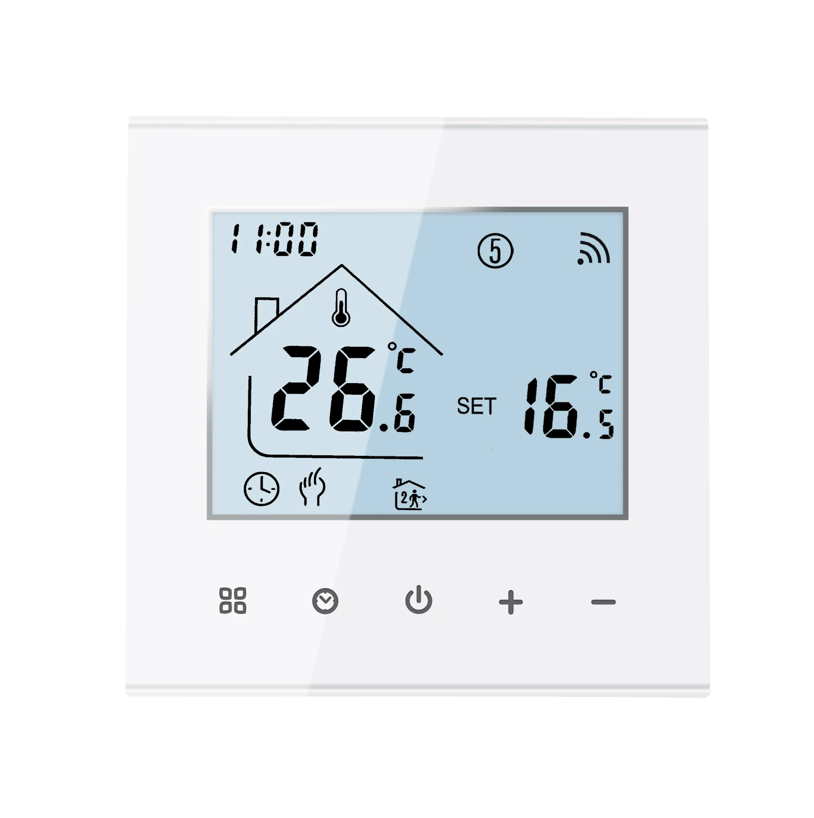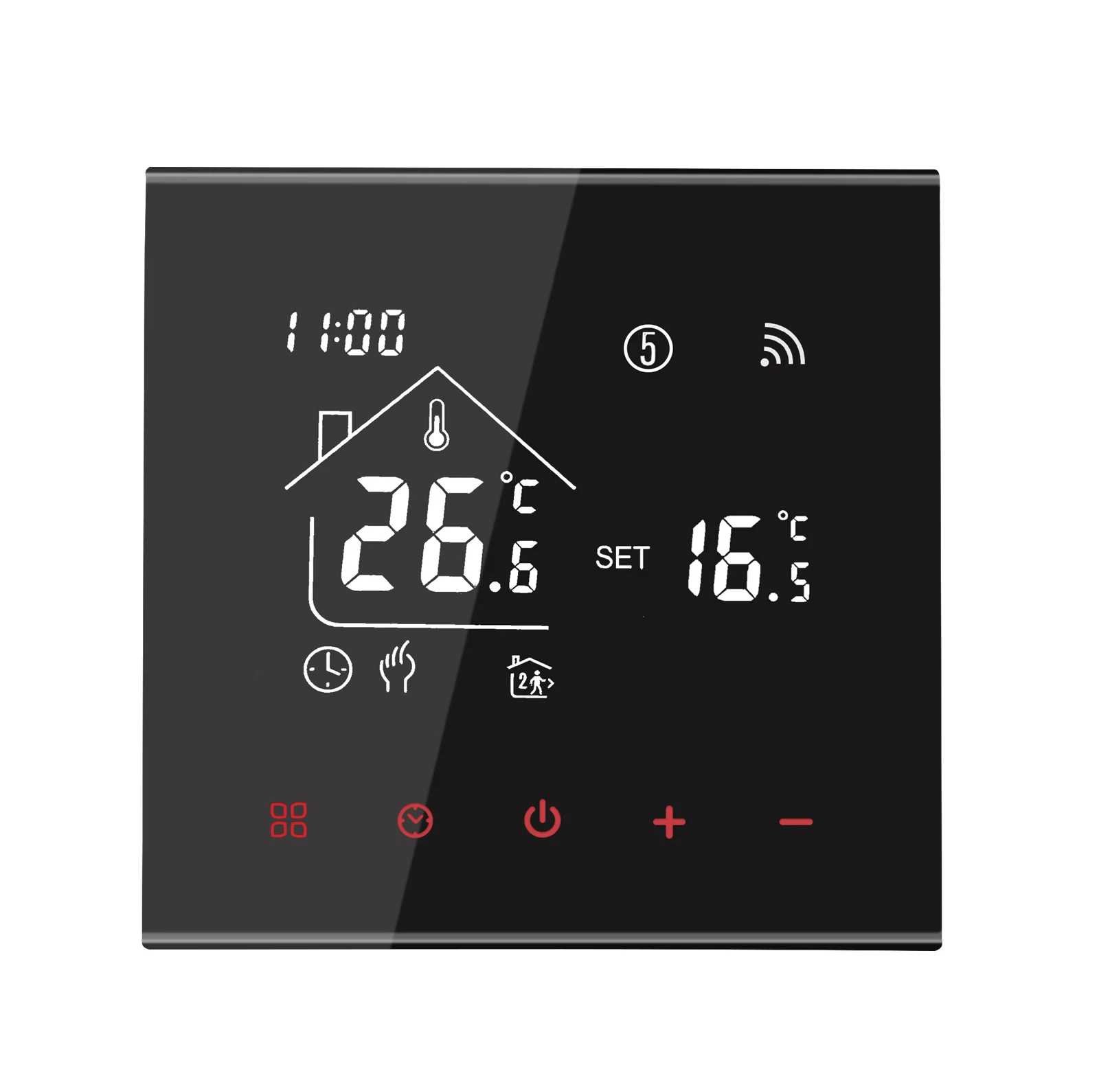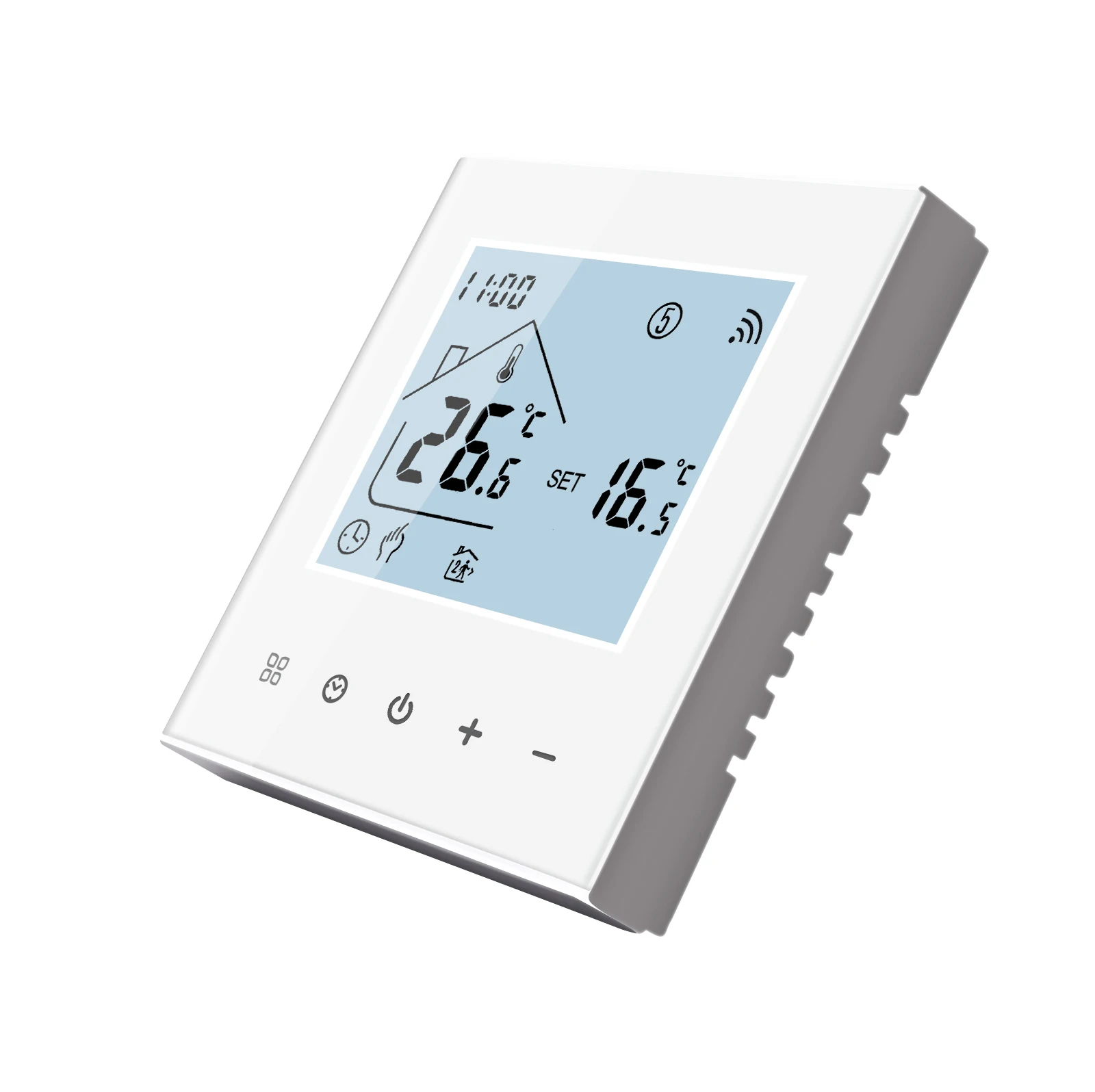 Consommation électrique: <1. 5W Matériau de la coque: PC + ABS (ignifuge) Boîte d’installation: 86*86mm carré ou boîte ronde européenne de 60mm Bornes de fil: Fil 2×1.5 mm2 ou 1×2.5 mm2 Classe de protection: IP20 APP: Tuya vie intelligente Fonctions du thermostat: -1. Fonction mémoire Protection contre la mise hors tension, enregistrez tous vos paramètres en toute sécurité. -2. Fonction programmable Fonction programmable uniquement pour le type WiFi, uniquement programmable sur les téléphones mobiles. -3. Insérer et deux capteurs externes. Le câble de capteur externe est inclus pour le type de plancher électrique 16A. -4. Costume pour différents types de système de chauffage électrique Le thermostat convient au câble chauffant, au tapis chauffant, au film chauffant et à d’autres appareils de chauffage électrique. -5. Fonction Wifi Le thermostat wifi peut être contrôlé par l’application mobile où que vous soyez.
