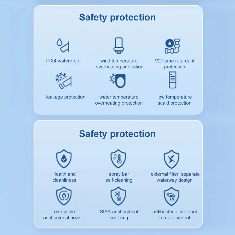 Santé et propreté : barre de pulvérisation autonettoyante, filtre externe, conception de voie navigable séparée, buse antibactérienne amovible, anneau de selle antibactérien SIAA, télécommande en matériau antibactérien.