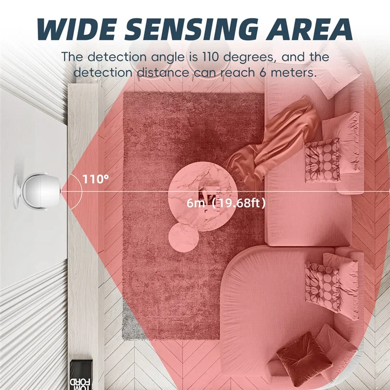 LARGE ZONE DE SENSION: L’angle de détection est de 110 degrés et la distance de détection peut atteindre 6 mètres.