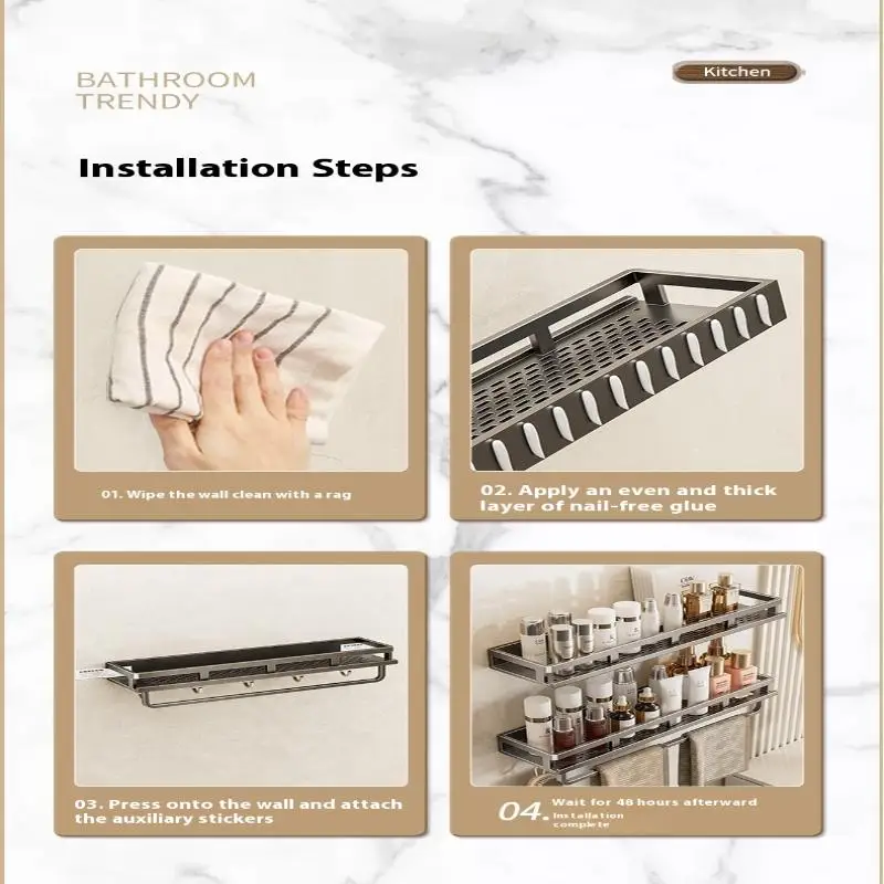 -En salle de bain, mettre des articles de toilette sur des étagères de rangement, comme shampoing, revitalisant, gel douche, etc., mettre une serviette ci-dessous. Dans la cuisine, l’étagère flottante peut être utilisée pour mettre des bouteilles d’assaisonnement, le porte-serviettes peut être utilisé pour accrocher des serviettes. Parfait également pour la chambre, le salon, le bureau, etc.