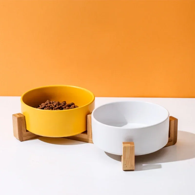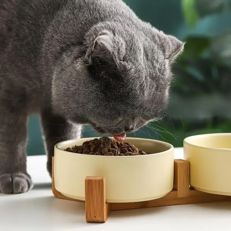 Support en bois en céramique pour animaux de compagnie, Double bol, plat intégré pour manger des animaux de compagnie, bol à boire, protéger les petits chats, chiens, cou, mangeoire sans déversement