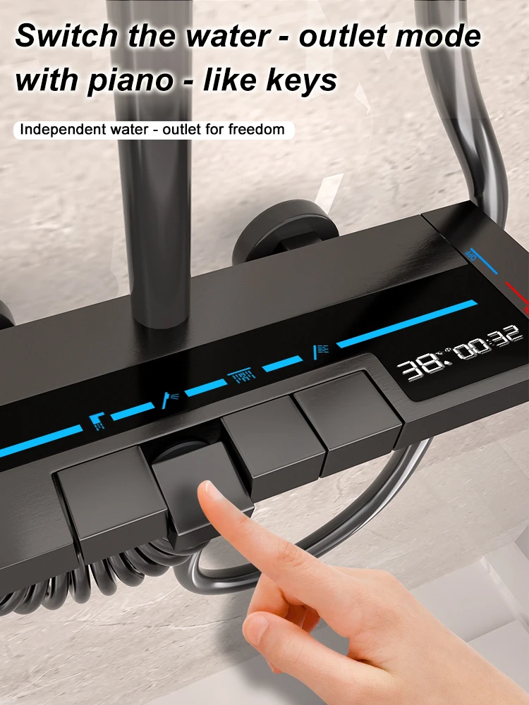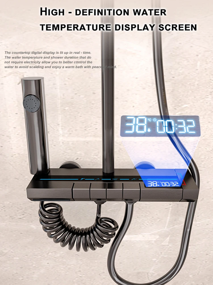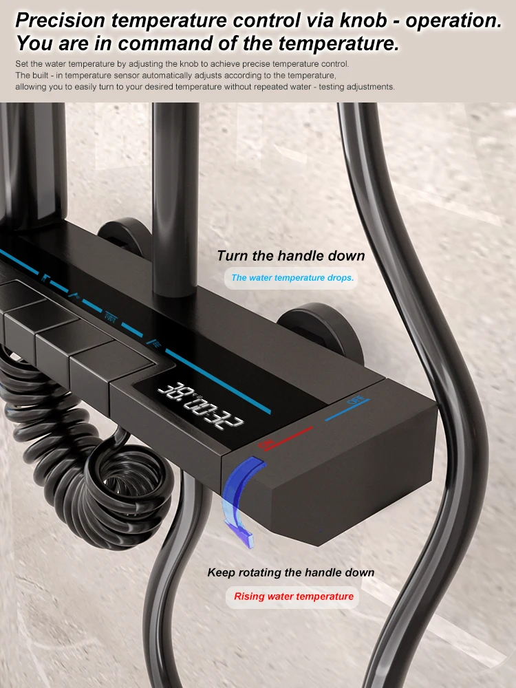 Description de l’affichage de la température de la lumière ambiante : production d’énergie du débit d’eau, micro générateur de débit d’eau intégré, pas de batterie, pas de plug-in