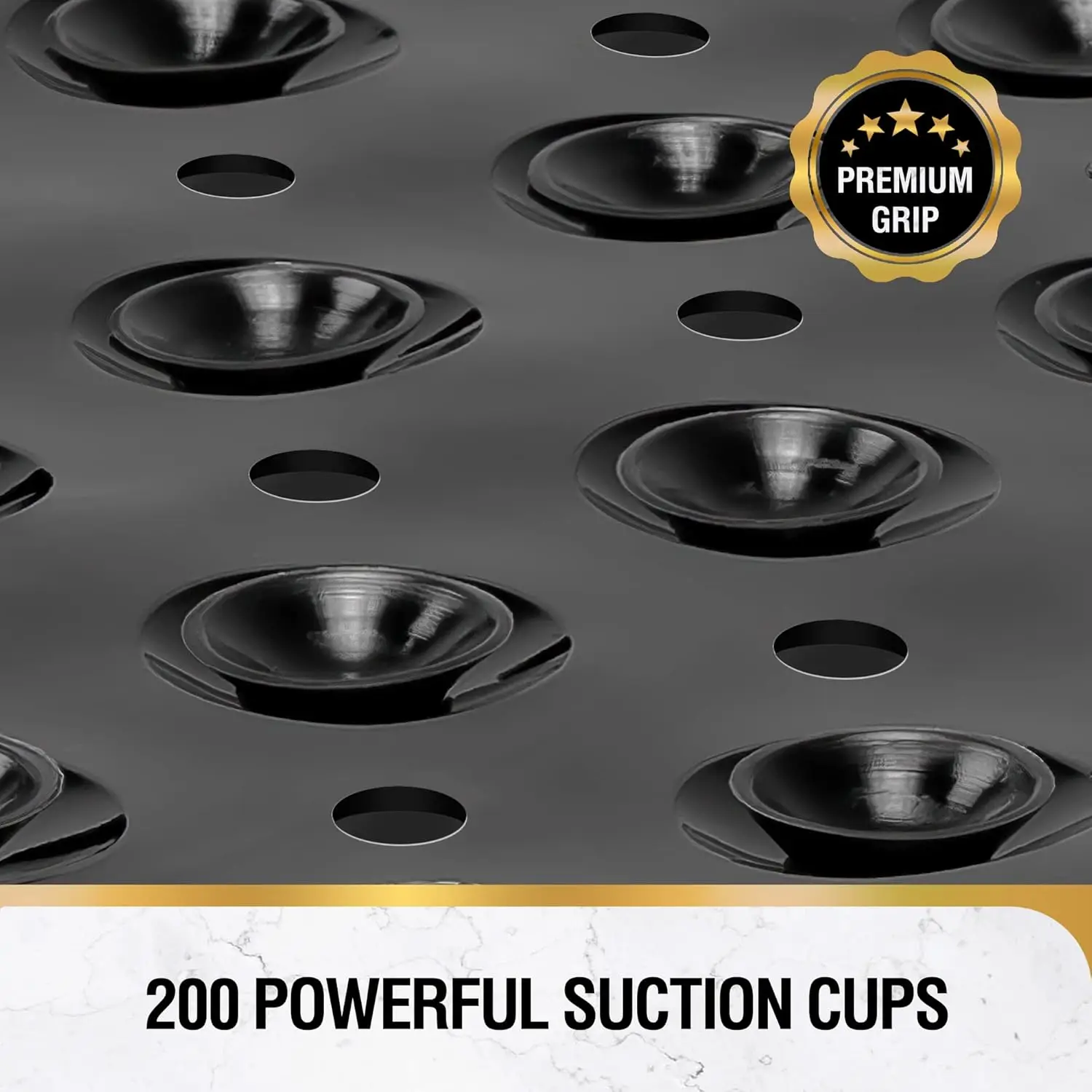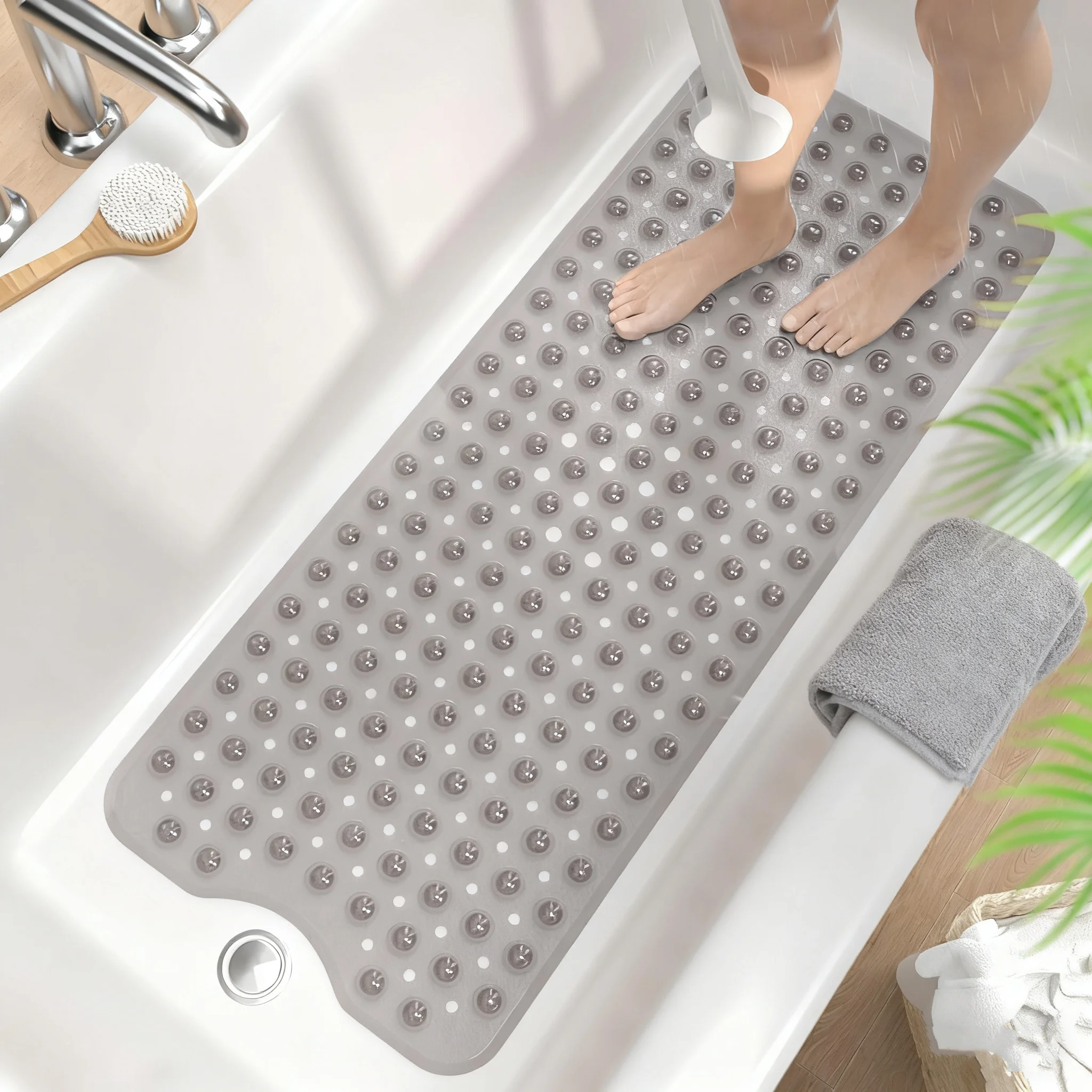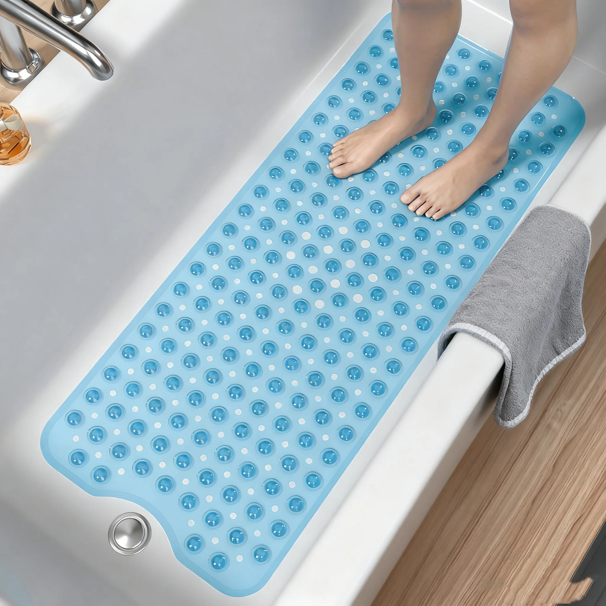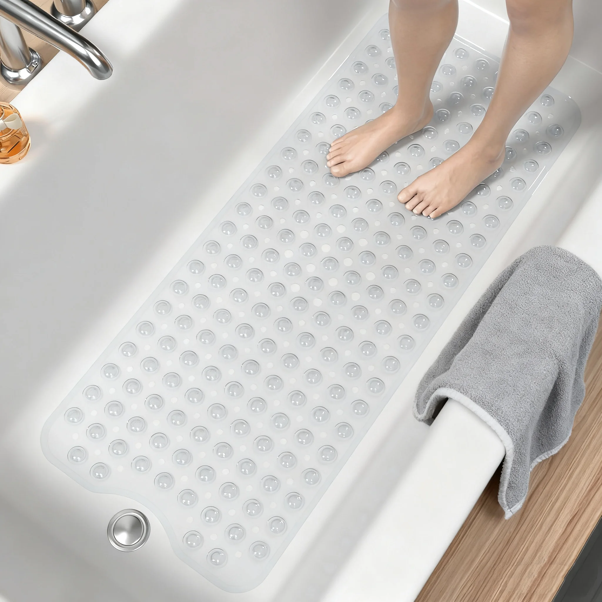 Conception de ventouses pour la sécurité— effet antidérapant visible.Les ventouses scellées sous vide agrippent fermement la baignoire/le sol lisse, empêchant tout mouvement et dérapage.C’est la garde de la salle de bain pour la famille.