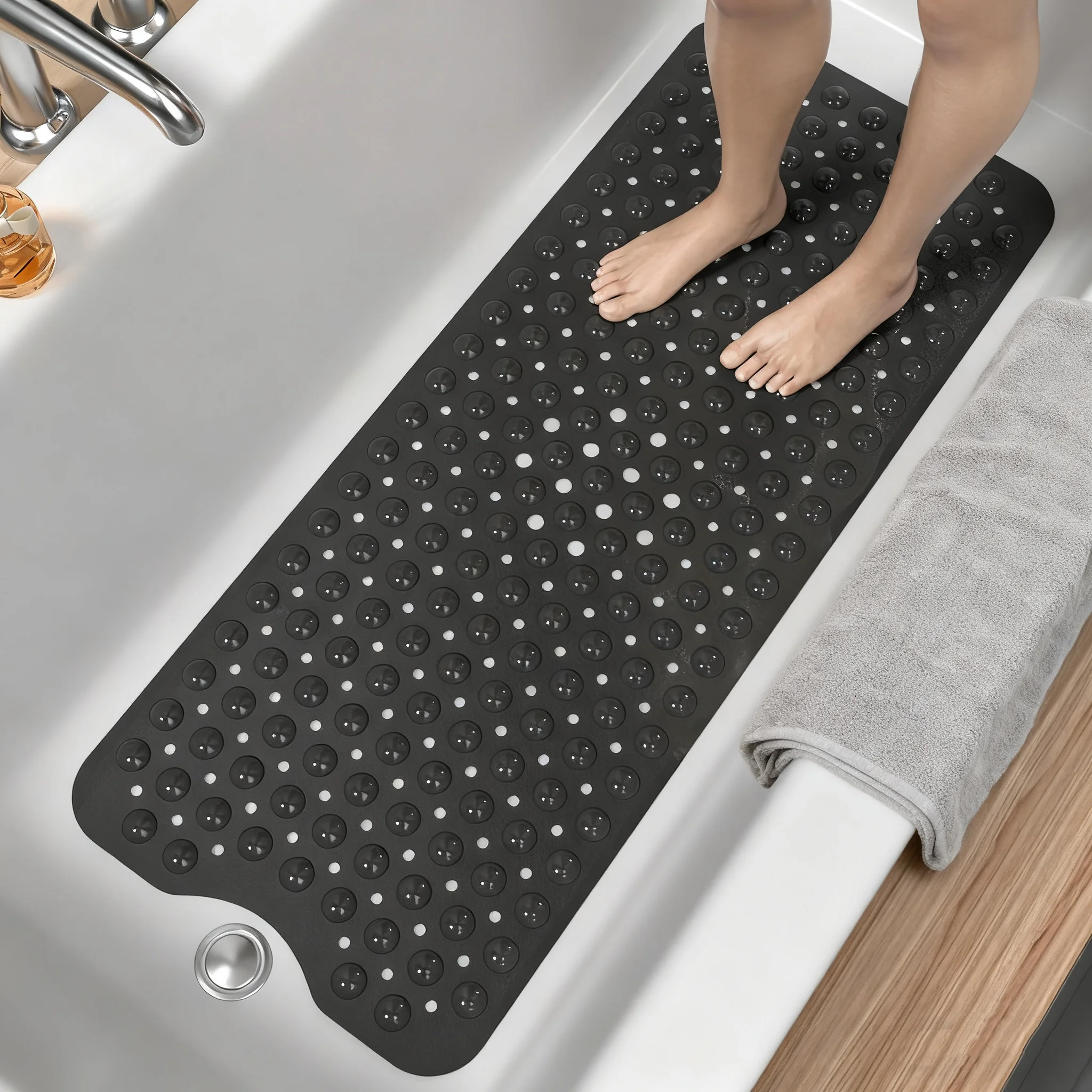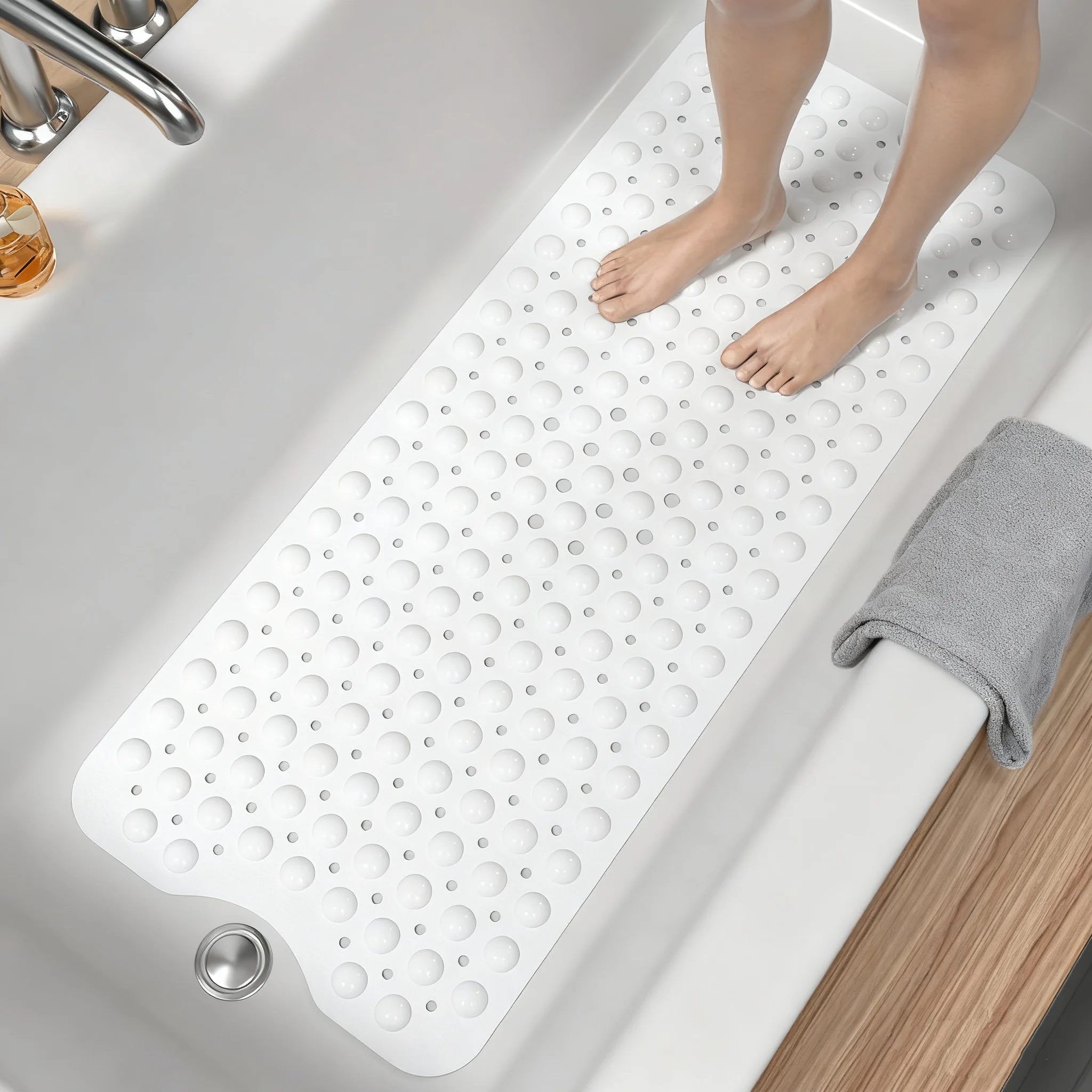 Matériau PVC de qualité supérieure— qualité tangible : texture douce sous les pieds, grande durabilité, inodore et séchage rapide à l’air.Un design simple dans une variété de couleurs se fond parfaitement dans les salles de bains modernes, les espaces résidentiels, les douches d’hôtel et plus encore, transformant l’heure du bain en moments de type spa où que vous soyez.