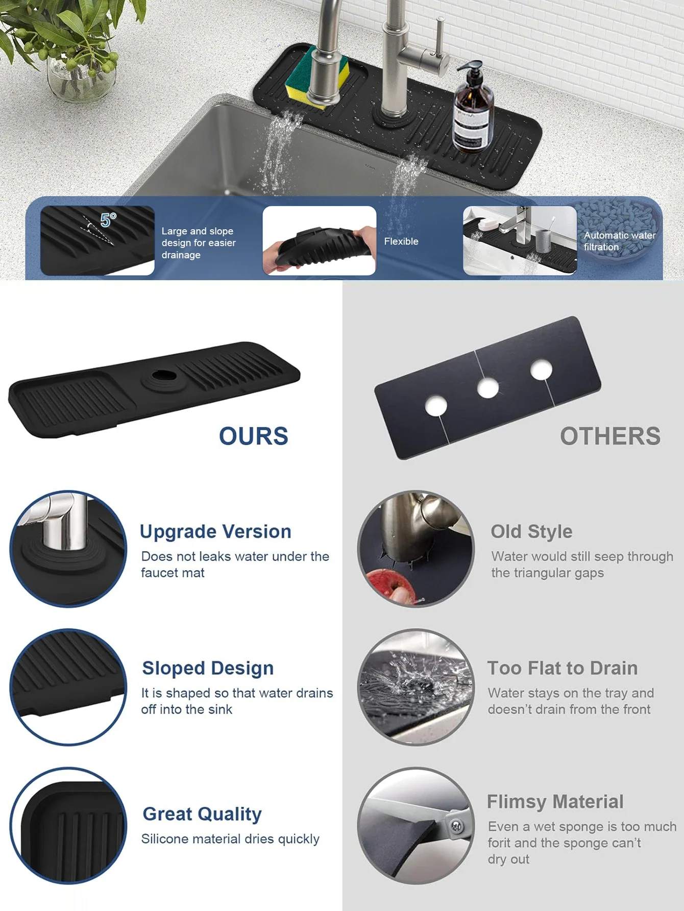 【ASY TO CLEAN】 Le tapis de robinet ordinaire pour évier de cuisine est difficile à nettoyer et pas facile à sécher. Il est facile aux bactéries de race dans un environnement humide à long terme. Notre protège-éclaboussures de robinet en silicone est inodore. Rince simplement avec de l’eau ou de lancer dans le lave-vaisselle, sèche plus rapide et pas besoin de nettoyer ou remplacer l’épéritement. Pas besoin d’essuyage du comptoir d’évier après chaque utilisation du collecteur d’égouttement de robinet de cuisine, alors vous pouvez dépenser moins du temps de nettoyage.