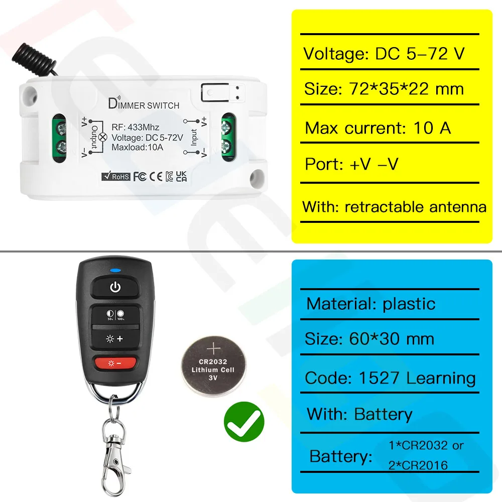 Dans ce lien, nous fournissons un contrôleur de commutateur de gradateur DC 5-72V et un émetteur à distance (batterie incluse)