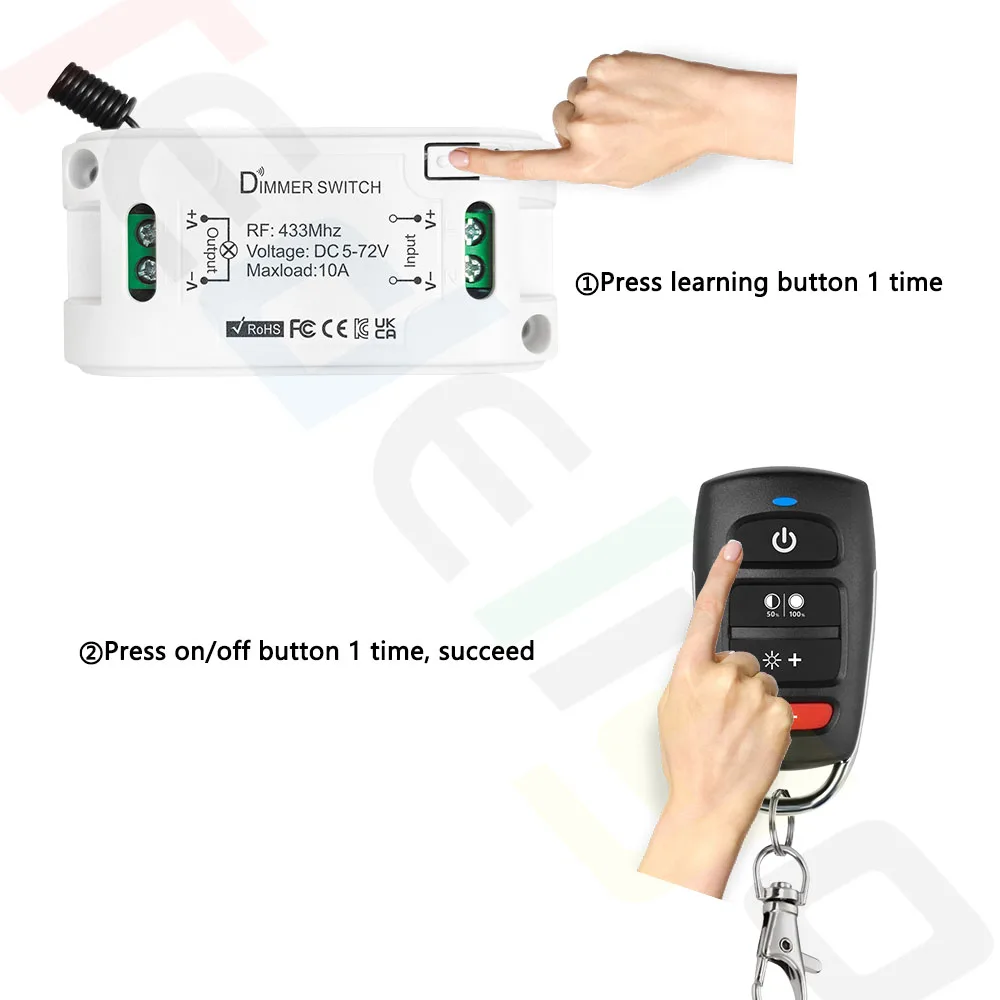 1. Contrôleur de gradateur RF couleur unique: il peut fonctionner avec les luminaires LED DC 5V 6V 12V 24V 36V 48V 72V(5-72V). Sortie égale puissance d’entrée. Veuillez ne pas vous connecter avec une alimentation AC