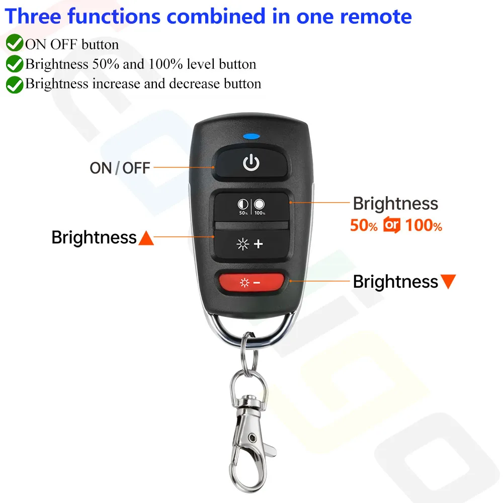 2. Télécommande puissante: toutes les fonctions dans une télécommande à quatre boutons, y compris la fonction onoff, la fonction luminosité 50% 100% et la fonction de réglage de la luminosité.