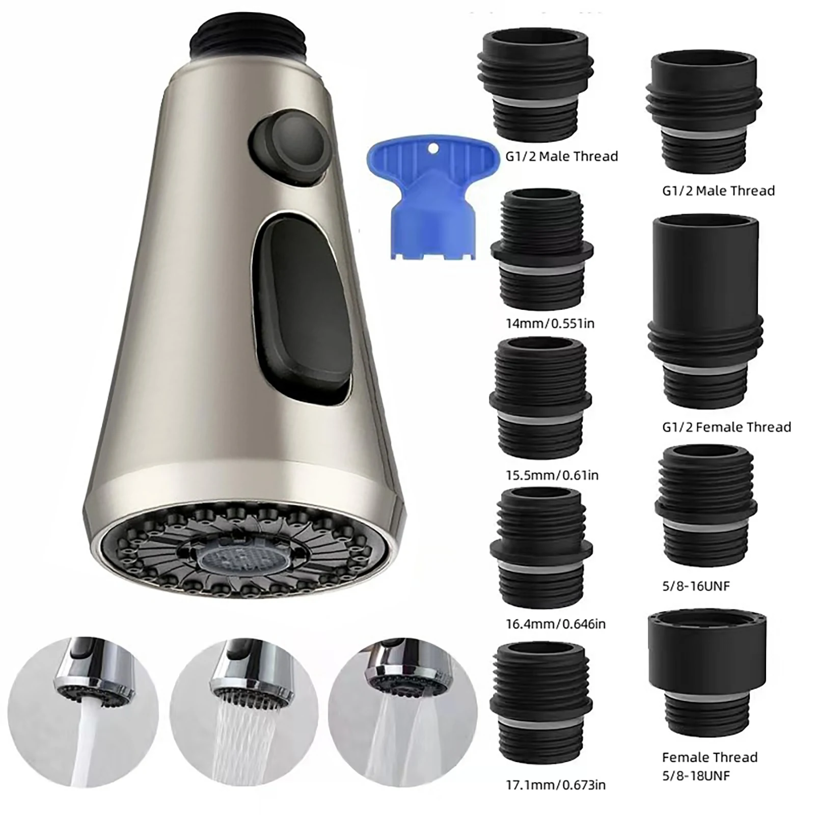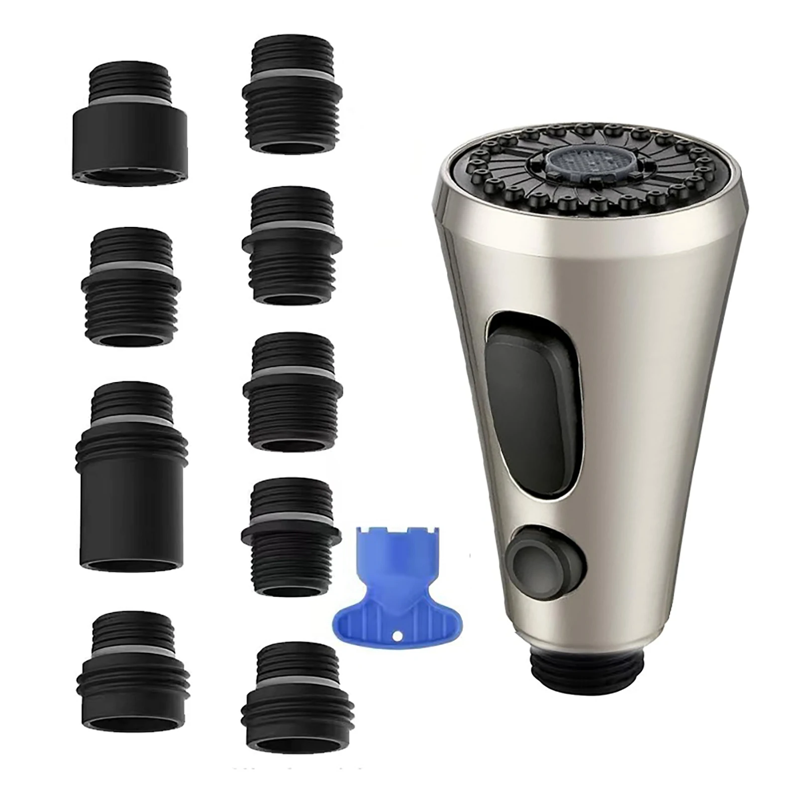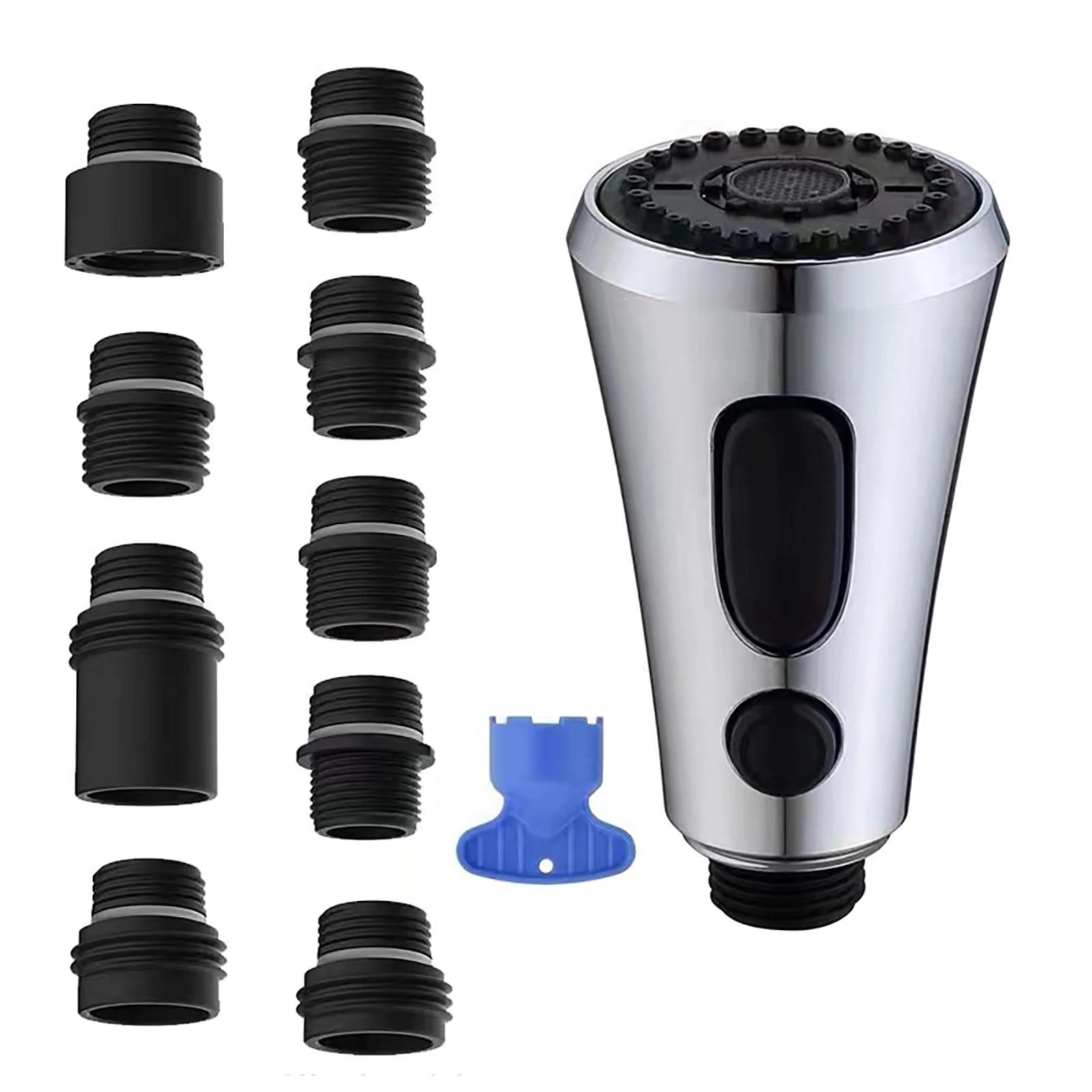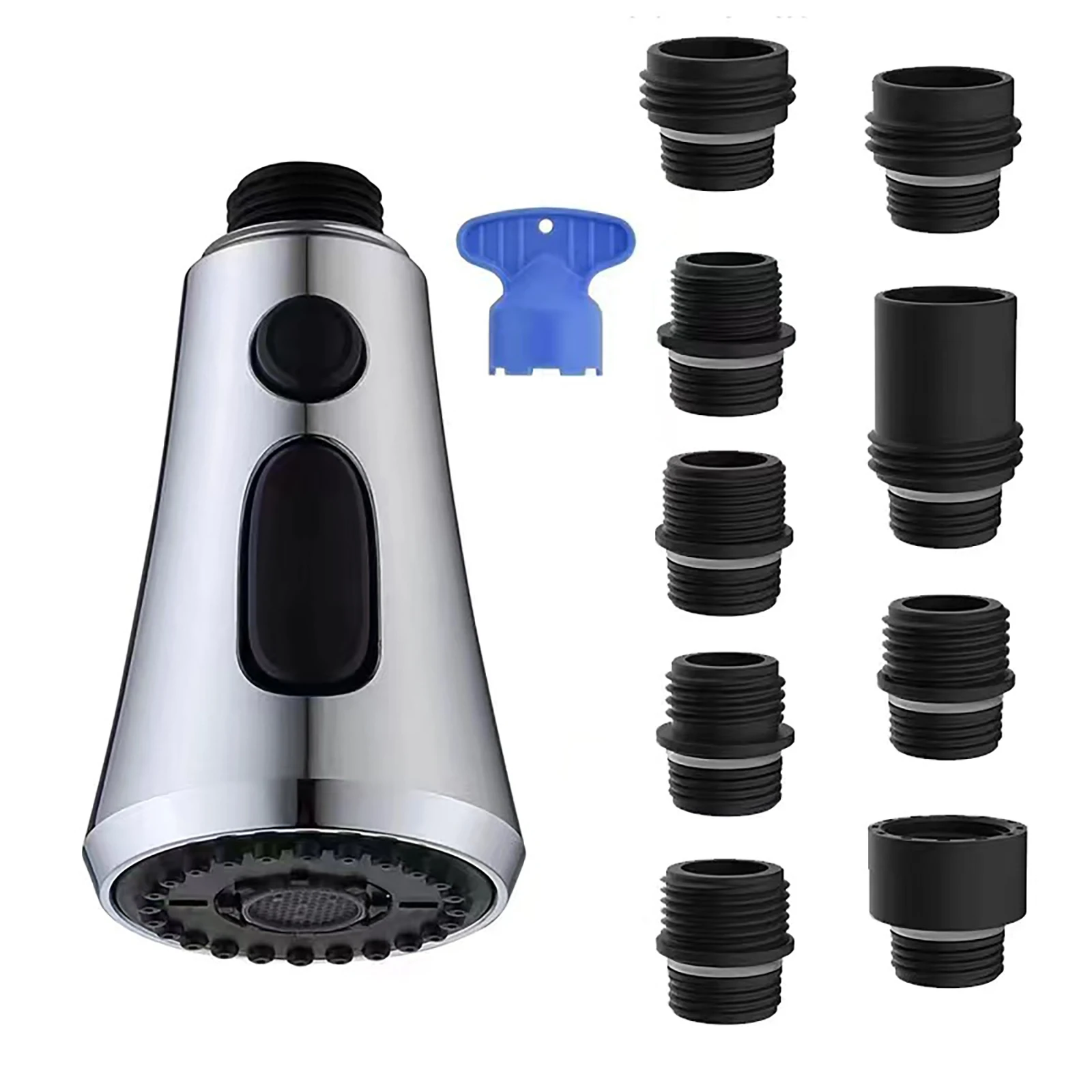 Tête de pulvérisation Robinet de cuisine à tirette G1/2 avec 9 adaptateurs différents Kit de connecteurs en plastique 3 Modes Tête de pulvérisation de robinet à économie d’eau