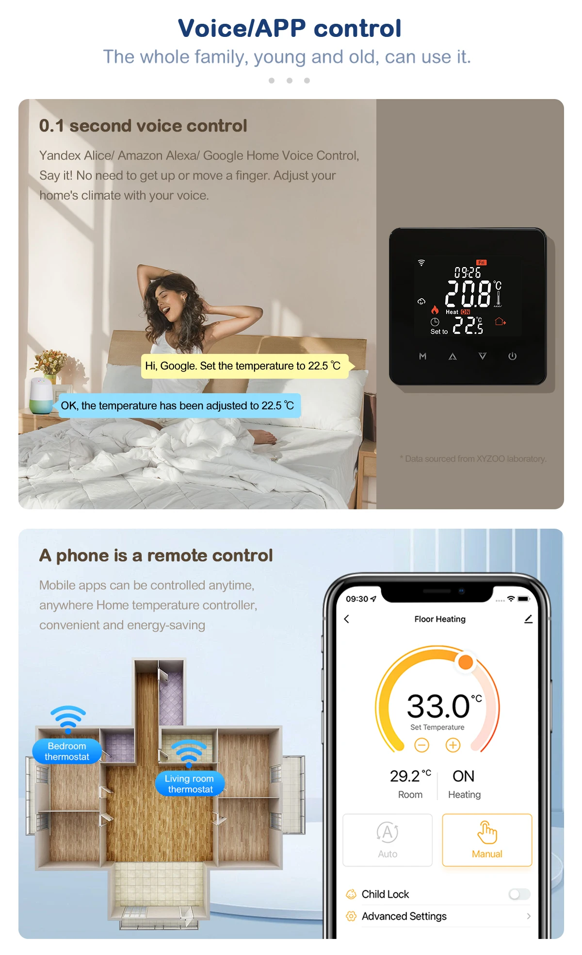 Le thermostat XYZOO vous aide à économiser jusqu’à 26% * par an sur vos coûts de chauffage grâce à la technologie de détection sensible qui détecte le chauffage dans un environnement à 360 °.
